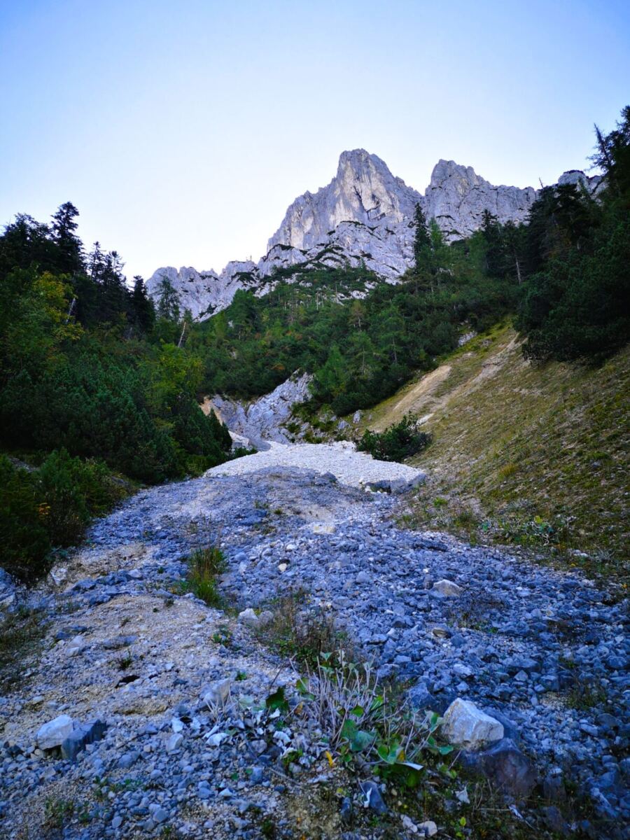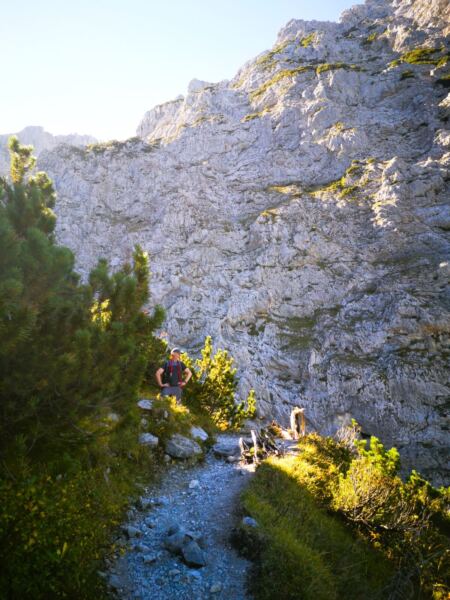 Wir folgen dem Steig bergab. Er bringt uns bald zum Fuß der Kreuzwand. Der schmale Pfad durch die Schuttfläche sieht herrlich-dramatisch aus, ist aber angenehm zu gehen, auch für unseren Amos. Der Pfad leitet uns hinüber zum Einstieg ins Dammkar etwas oberhalb des „Bankerls“ an der Talstation des Materiallifts, der die Damkarhütte versorgt.
