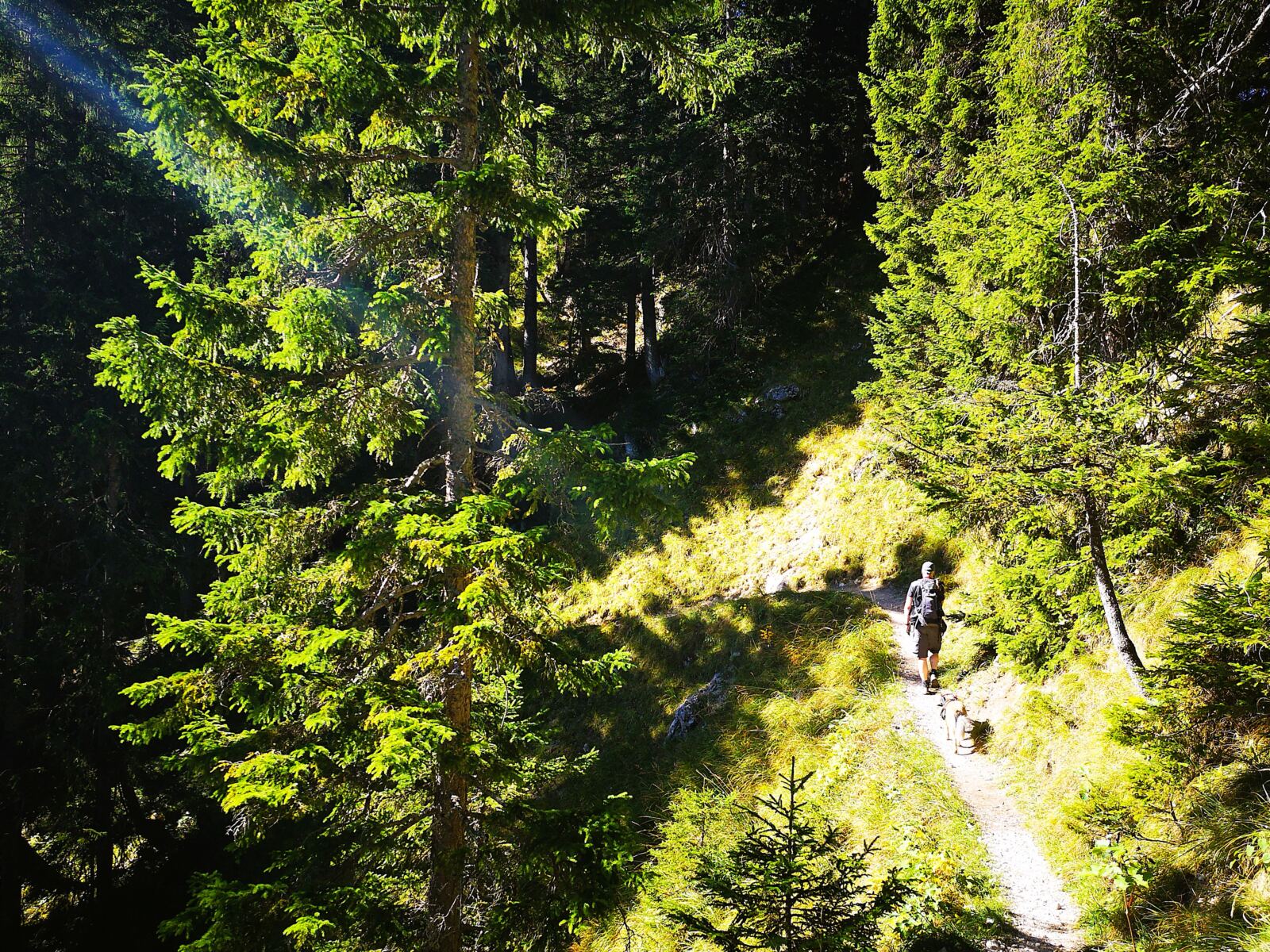 Hinter der Brücke biegen wir rechts ab, laufen bergauf und erreichen den Ochsenbodensteig. Wir folgen dem schönen Bergsteig in vielen Serpentinen durch den Bergwald aufwärts. Unterwegs laden viele Bänke zu kleinen Pausen ein. Tatsächlich verlocken Natur und Aussicht zu weit mehr Stopps, als nötig wären.