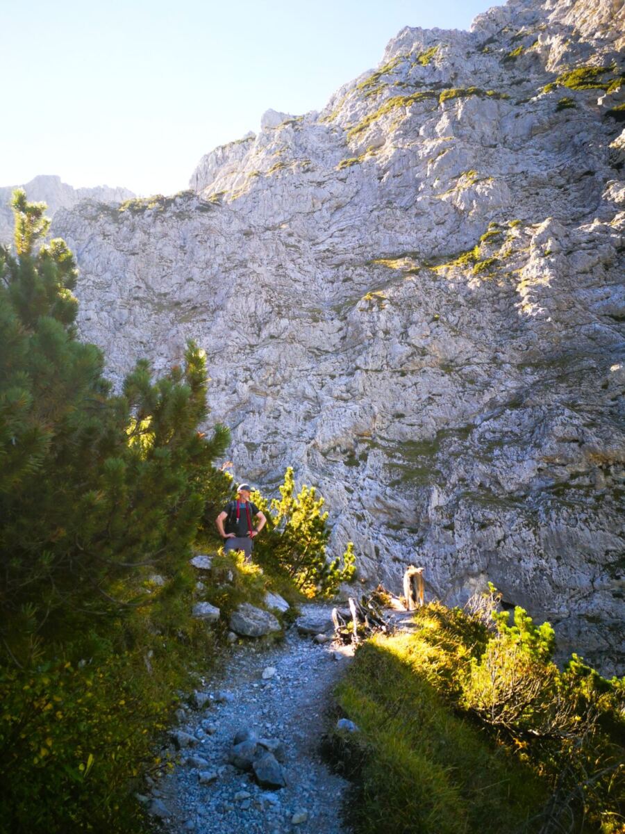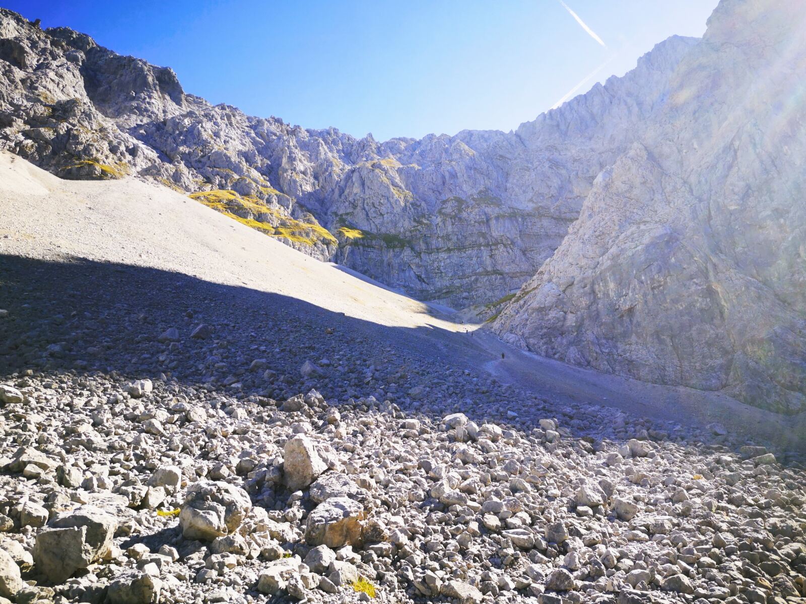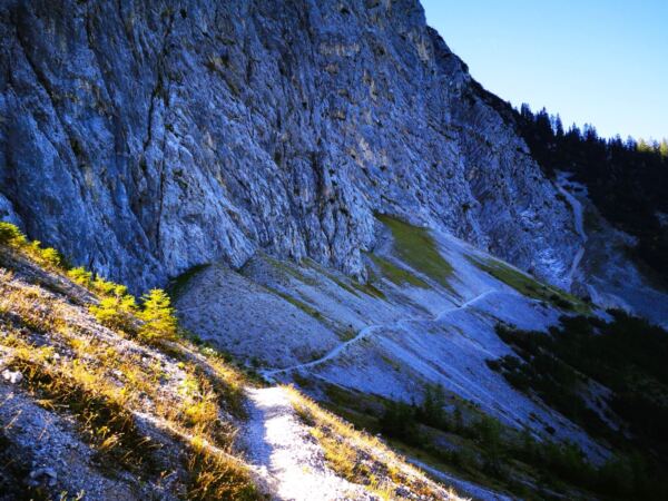 Eine der dramatisch-schönsten Stellen unterwegs: Blick auf den Pfad durchs Schuttfeld am Fuß der Kreuzwand.