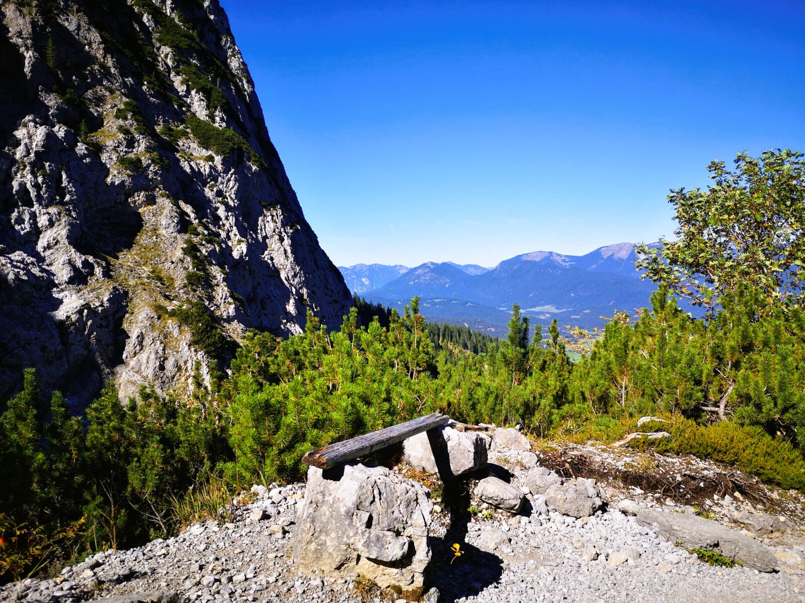 Mit schönem Blick auf Viererkopf und die Karwendelspitzen laufen wir geradeaus auf dem Karwendelsteig, flankiert von lichtem Buschwerk. An der nächsten Kreuzung – rechts ginge es zur Mittenwalder Hütte – verlassen wir den Karwendelsteig und halten uns links. Über eine Betonbrücke überqueren wir einen gepflasterten und trockenen Wasserlauf. Wir kommen an der Wegmarke „Arzgrube“ vorbei. Offenbar gab es ganz in der Nähe einen heute stillgelegten Marmorbruch.