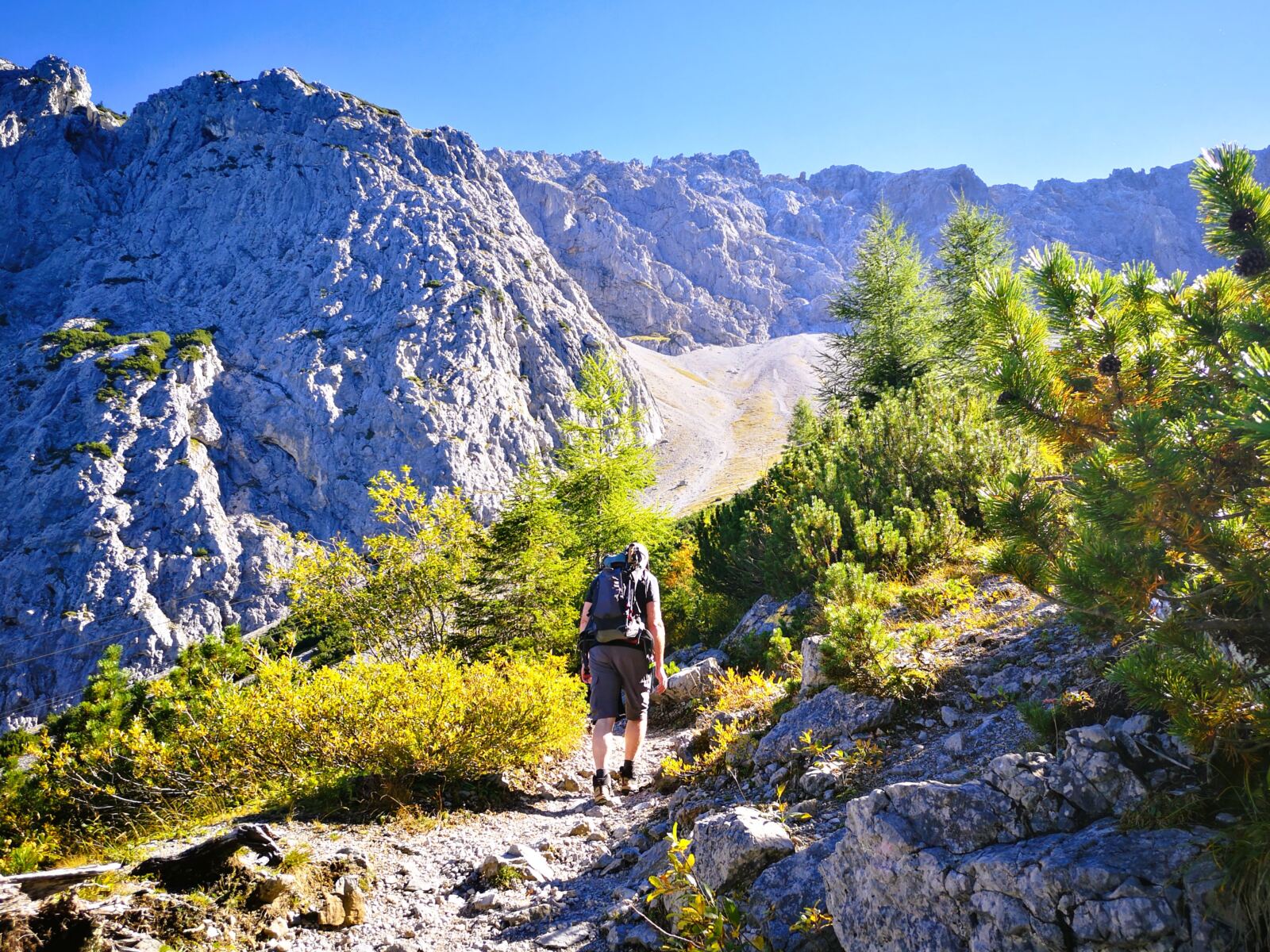 Jetzt wird der Anstieg rauer, die Steinbrocken auf dem Weg größer und kantiger. Zwischen Latschen und Fels steigen wir recht steil neben der Materialseilbahn auf – und erreichen wenig später die Dammkarhütte vor atemberaubender Kulisse.