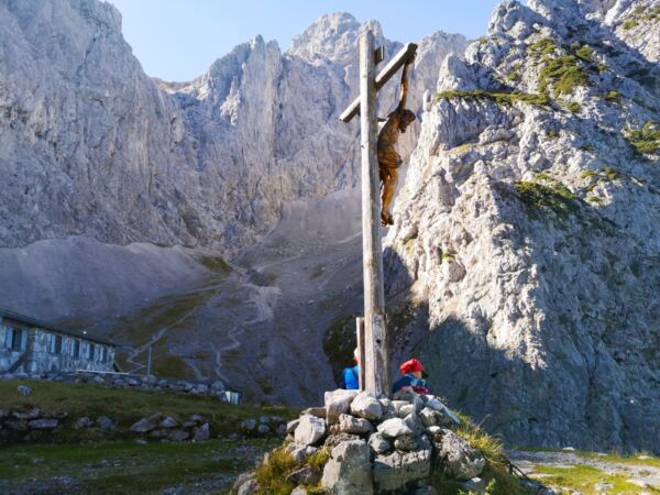 Angekommen: die Hütte am vorderen Dammkar, davor das Kruzifix