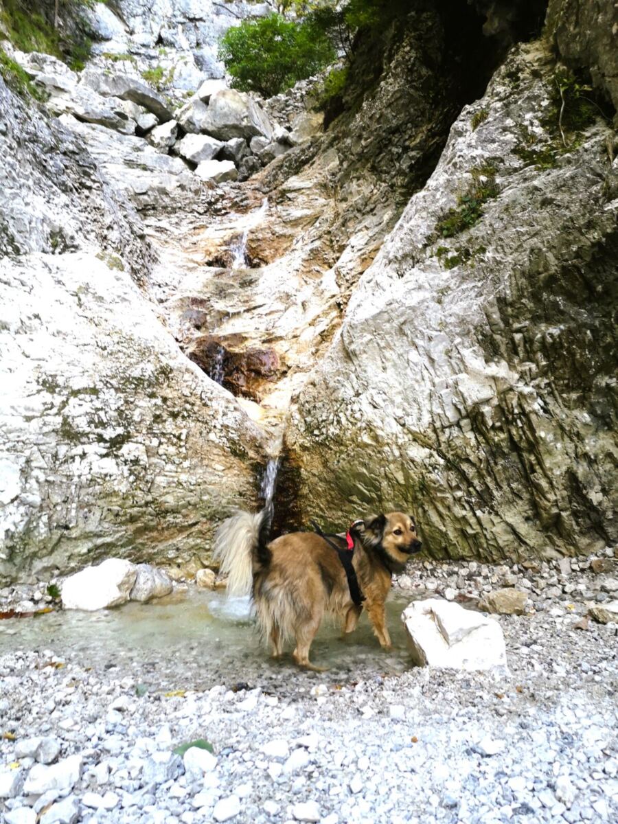 Auf dem Rückweg gönnen wir Amos noch eine kleine Planschpause in den Gumpen hinter der Arzgrube. Das Rauschen des Wassers hate er schon auf dem Hinweg gehört und wäre gerne abgebogen. Jetzt endlich. 🐕