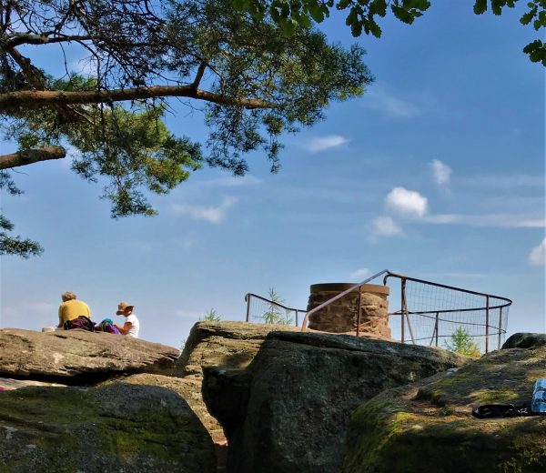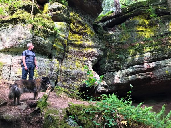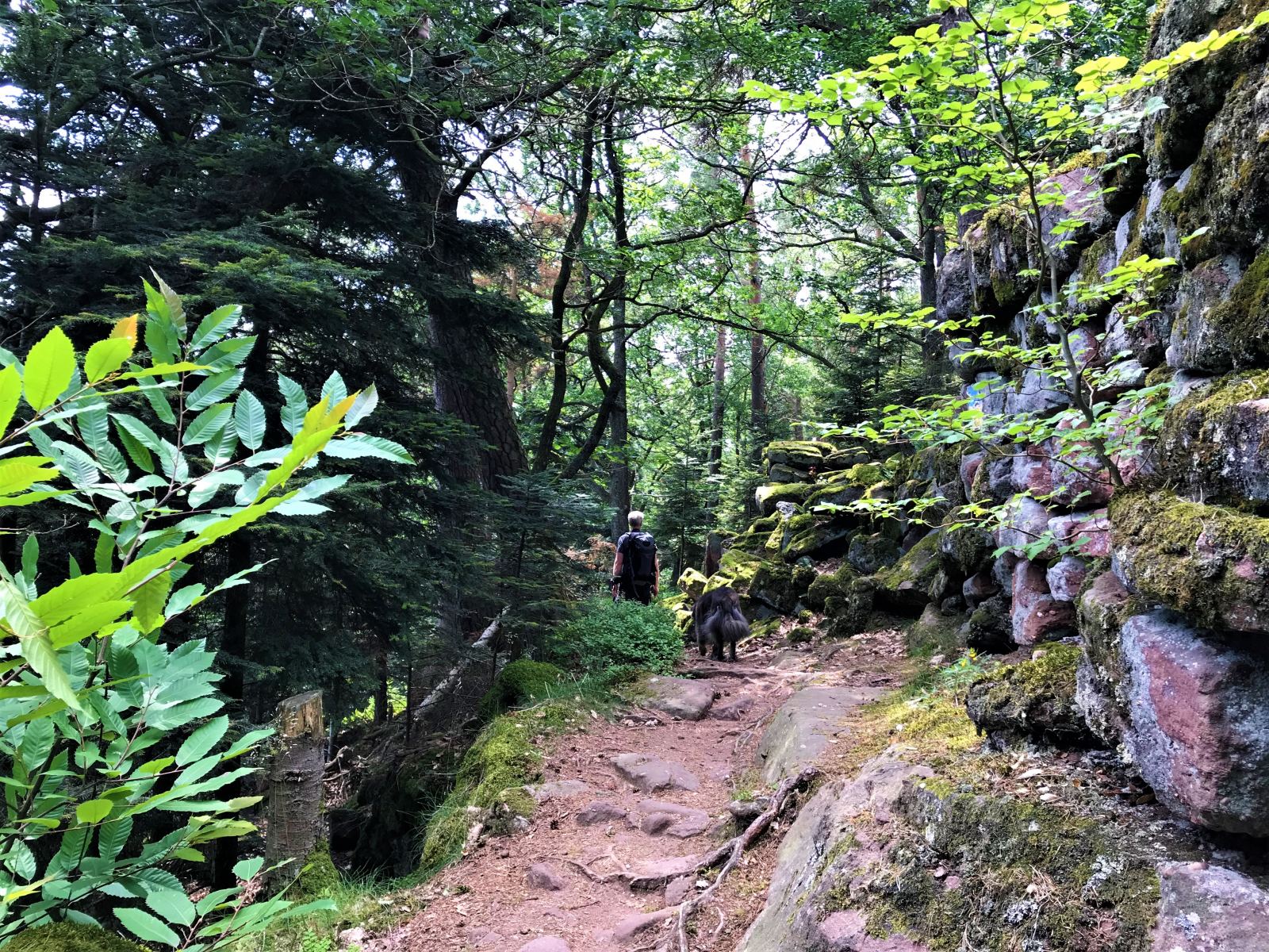 Am Rand der Vogesen erhebt sich der Odilienberg knapp 800 Meter über die Oberrheinebene. Obenauf: das Kloster der heiligen Odilia, Anziehungspunkt vieler Besucher. Hunde sind in der Klosteranlage nicht willkommen. Egal! Denn mindestens ebenso mythisch ist der Wald, der das Kloster umgibt. Unsere Tour führt auf weitgehend hundepfotenweichen Pfaden entlang der Heidenmauer. Wer die unzähligen Steinquader auf einer Länge von 10 Kilometern (!) wann und warum aufeinander gestapelt hat – darüber rätseln Forscher noch heute. Ebenfalls erstaunlich, aber von der Natur geformt: die oft meterhohen Buntsandsteinfelsen, die wie schlafende Tiere zwischen Eichen, Kiefern und Blaubeerbüschen liegen. Apropos Tiere: Die stehen, aus Holz geschnitzt, am Rand des Wegs, der zwischendurch immer wieder Ausblicke in die Rheinebene gewährt. Ideal auch für sonnenheiße Tage, denn im Schatten des Waldes bleibt es kühl und ruhig. Eine Genuss&Guck-Runde für Hund und Mensch.