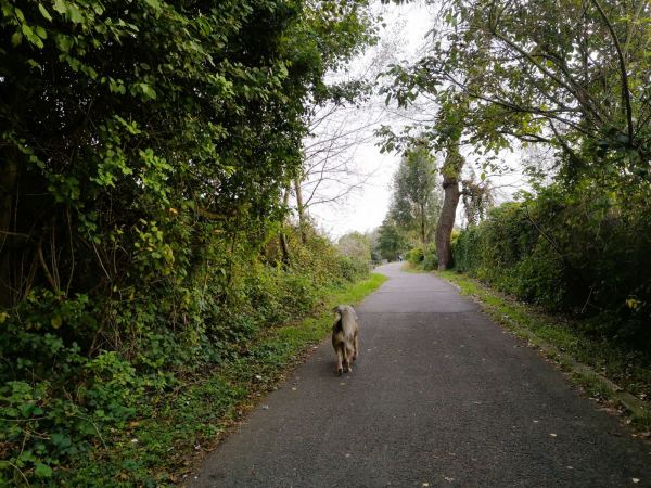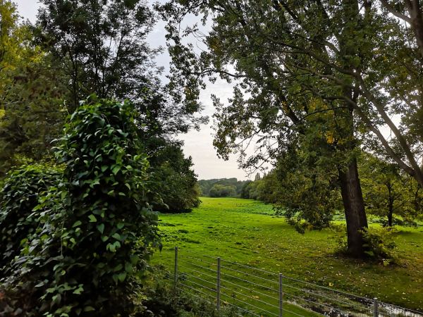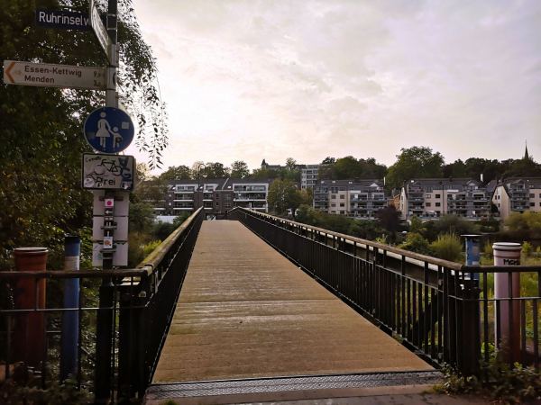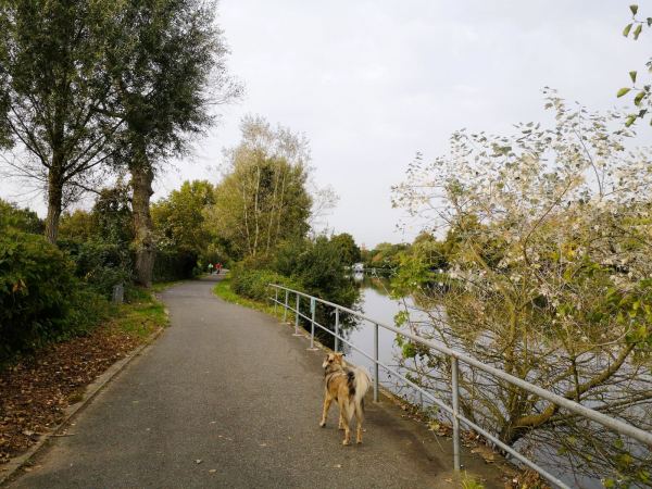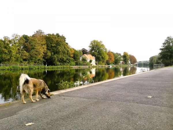 Vorbei am Wasserbahnhof, wo die Passagierschiffe der Weißen Flotte zu ihren Fahren nach Essen-Kettwig und durchs Ruhrtal auslaufen, erreichen wir die Insel über die Brücke am Wasserkraftwerk und biegen dahinter – und vor der Kassenbergbrücke über die Ruhr – direkt links ab. Ab hier darf unser Hund frei laufen und begegnet vielen Spielgefährten. Den geteerten Weg müssen wir uns allerdings auch mit Radlern teilen. Auf die weiten Auenwiesen können wir nicht ausweichen. Die stehen unter Schutz und sind mit einem hohen hohen Zaun abgesperrt. Trotzdem schön hier, insbesondere an regnerischen Tagen, wenn hier kaum etwas los ist. Geeignet auch als Jogging-Strecke mit Hund. Auf dem großen Parkplatz auf dem Platz der Deutschen Einheit findet man in der Regel immer einen Parkplatz.