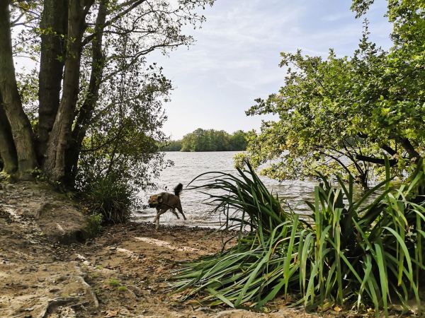 Schon vor einigen Jahren machte der Entenfang unschöne Schlagzeilen. Wegen Blaualgen wurde das Baden im See für Menschen und Hunde verboten – Gesundheitsgefahr. Noch 2020 galt das Badeverbot. Aktuell (Herbst 2023) ist die Wasserfläche wieder glasklar, Hunde, Pferde und Menschen gehen wieder in den See. Nur an einem Uferabschnitt – etwa im Bereich des Naturschutzgebiets – schillert das Wasser im Uferbereich verdächtig grünlich. Da unser Hund hier ohnehin an der Leine läuft, kann er auch nicht abtauchen. Also keine Gefahr.