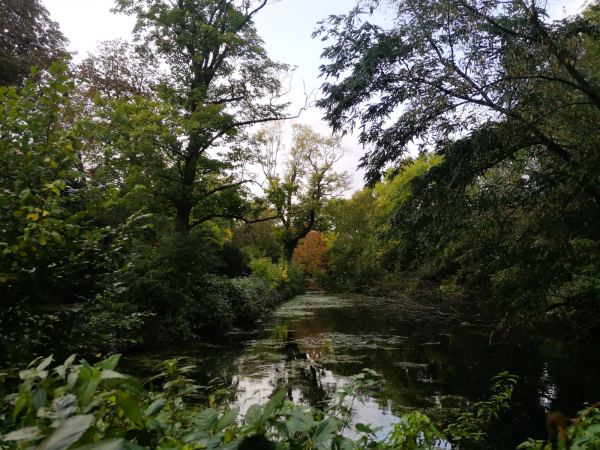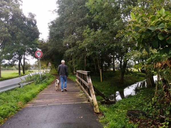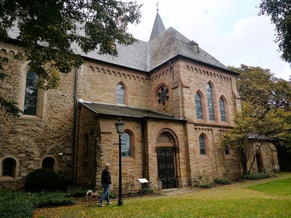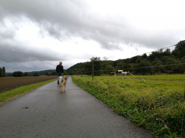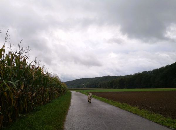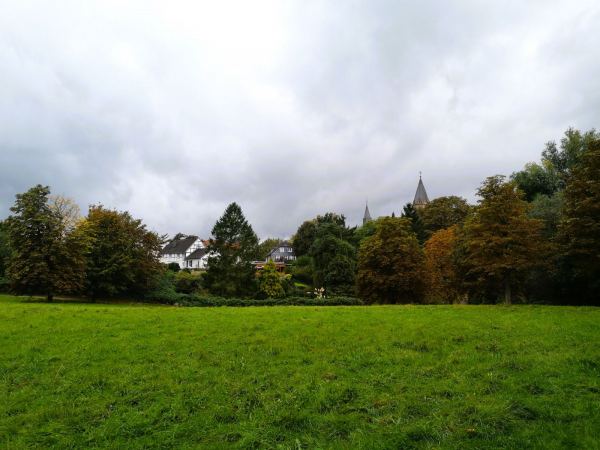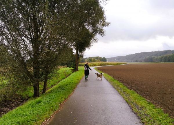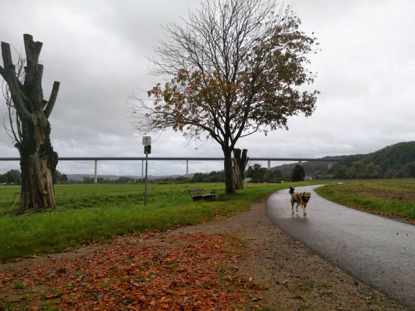 Wenn das Wetter usselig ist, die Schuhe hübsch sauber bleiben sollen und der Hund gelüftet werden muss, laufen wir gerne vom Kloster Saarn zur Ruhrtalbrücke. Es geht durch den Park am Kloster und weiter über den geteerten Wirtschaftsweg zwischen den Feldern zur Brücke. Vorteil des Regens: Während man sich sonst die Wege mit vielen Radlern teilen muss, sind wir jetzt fast allein unterwegs.
