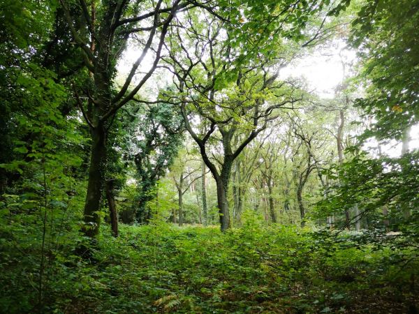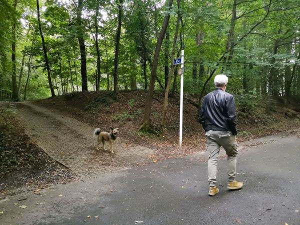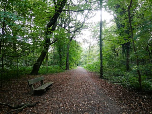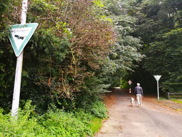 Der Weg bringt uns durch den Wald zunächst auf einem geteerten Sträßchen, die Artur-Brocke-Allee, die zu den letzten Häusern führt. Dann laufen wir eine Runde auf breiten Waldpfaden durchs Grün.