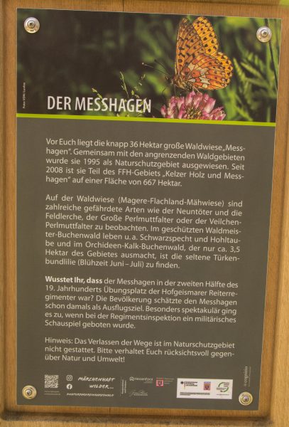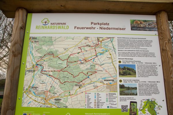 Wir starten am Wanderparkplatz Reinhardswald an der Feuerwehr in Niedermeiser und folgen der Wanderroute „1“ zum Naturdenkmal Rosenberg. Von dort aus führt uns die Tour über die Warme und dann entlang von Wiesen und Obstbäumen zum Schottenbruch von Niedermeiser. Am Wald entlang geht es weiter, dann führt der Weg bergauf auf den Messhagen mit vielen seltenen Pflanzen und Tieren. Der Weg dorthin war mit Ästen nicht leicht begehbar.