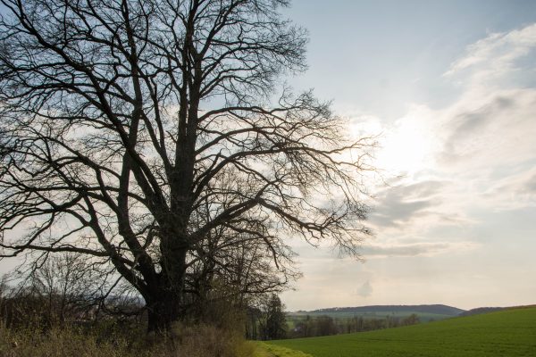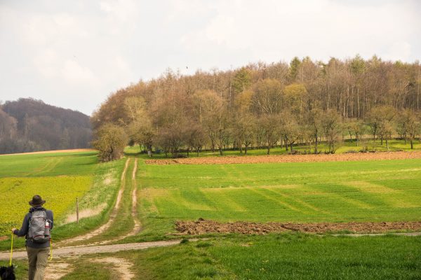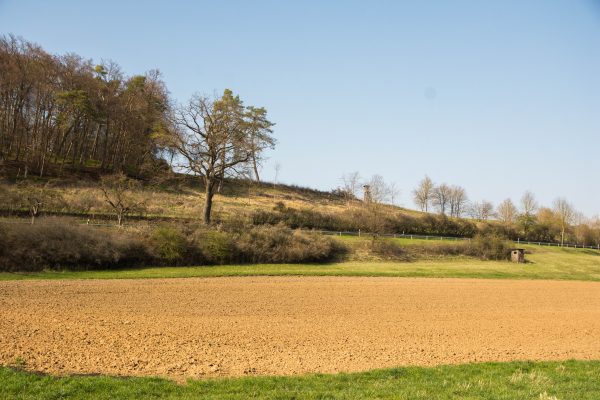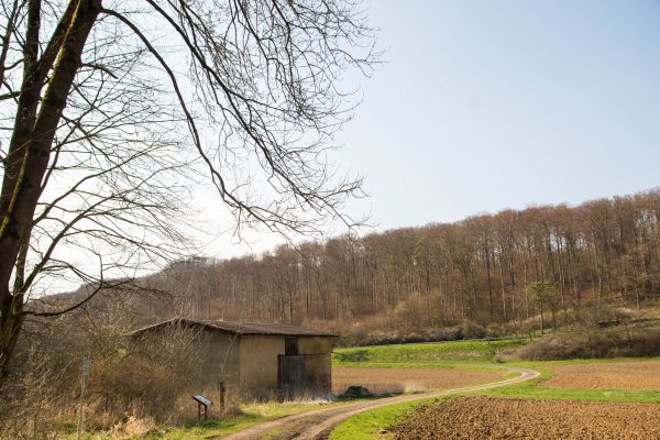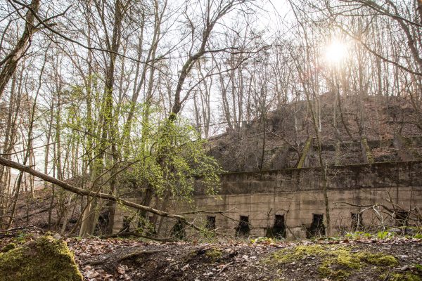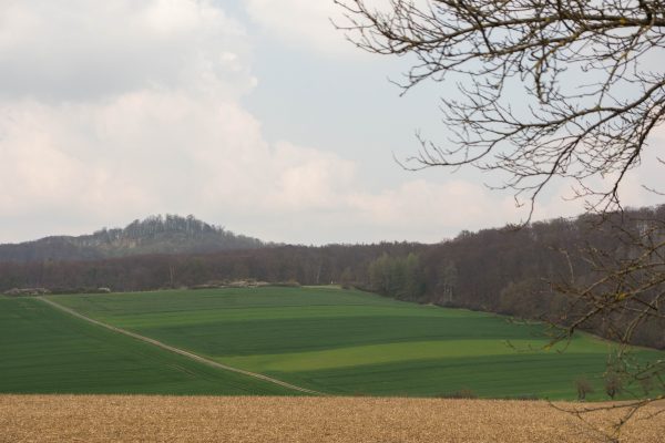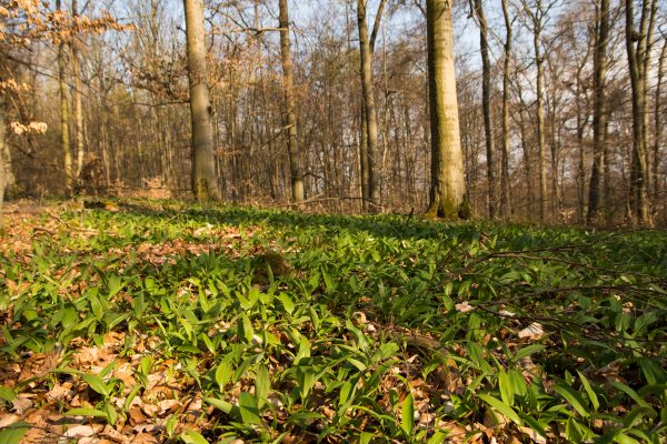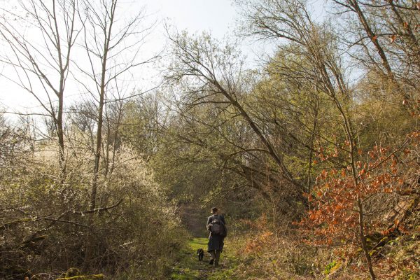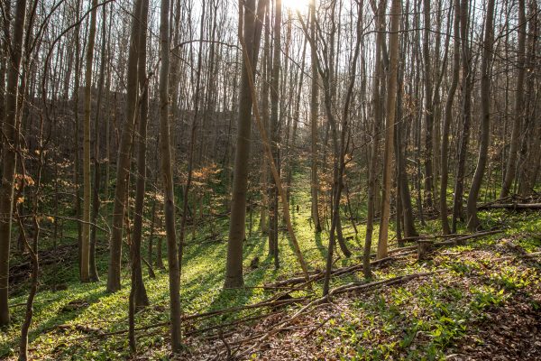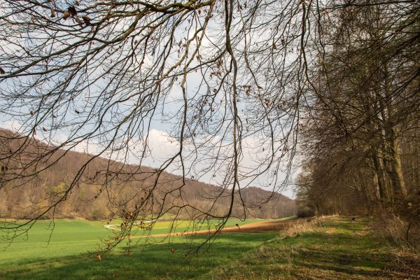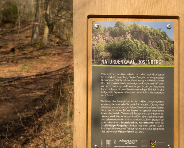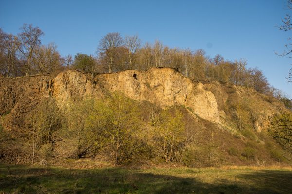 An der Ausgleichsfläche Messhagen vorbei, geht es wieder nach unten zur Warme. Dann folgt die zweite Steigung der Tour: Wir laufen durch den Buchenwald an Bärlauchfeldern vorbei und kommen zum Naturdenkmal Rosenberg. Ein ehemaliger Basaltsteinbruch, der von der Natur zurückerobert wurde.