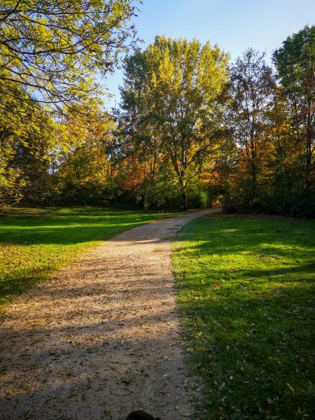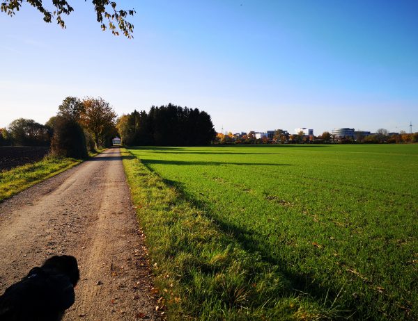 Wir starten an der S-Bahn-Station Unterföhring, von dort aus geht es gerade dahin bis zum Stadtrand. Wir laufen zuerst ein Stück zwischen den Äckern entlang, so können sich die Hunde noch etwas austoben, bevor wir das Naherholungsgebiet um den See erreichen: Hier gilt Leinenpflicht.