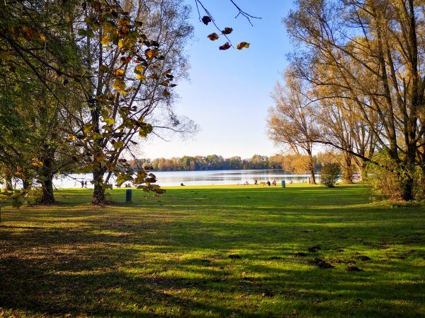 Die Runde um den See ist wirklich ein schöner Spaziergang, fast durchgehend hat man Blick auf den blau glitzernden See, daneben Liegewiesen und lichter Wald der sich jetzt im Herbst in seinen schönsten Farben zeigt. Auf Einsamkeit sollte man sich aber gerade an schönen Wochenendtagen nicht einstellen, der See ist auch außerhalb der Badesaison ein beliebtes Ausflugsziel.