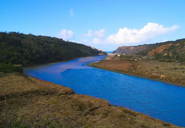 Wir starten mit Amos am großen Parkplatz an der Sackgasse „Estrada da Praia de Odeceixe“ auf dem Hügel über Strand und Meer. Hier kann man auch sein Wohnmobil problemlos parken. Übernachten ist allerdings verboten. Schade. Denn der Blick von hier oben auf das Mündungsdelta, die Klippen und das Meer ist wunderschön. Wir laufen vor zum Aussichtspunkt über der Praia de Ocedeixe. Dann geht`s zurück Richtung Parkplatz und auf der geteerten Zufahrt bis zu deren Ende. Die Straße mündet in einen Sandweg. Hier entdecken wir die grün-blaue Markierung, der wir von jetzt an immer folgen werden. Der Weg wird immer schmaler und bringt uns an die Klippen. Hier halten wir uns links. Wir folgen dem nun schmalen Pfad, der sich nur selten ein paar Meter von der Abbruchkante entfernt, der Küstenlinie entlang.