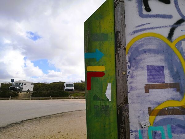 Am Parkplatz an der Sackgasse „Estrada da Praia de Odeceixe“. Der Fischerpfad ist hier mit blauem Pfeil markiert.