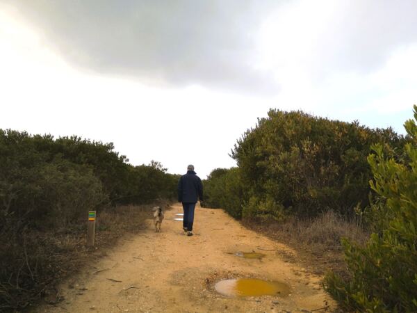 Unsere traumhaftschöne Wanderung mit Hund bringt uns über meist sandige Pfade auf dem Fischerpfad über die Steilküste. Plus Abstecher am kleinen Strand neben dem Hauptstrand von Odeceixe. Unterwegs nur Sonne, kein Schatten. Den haben wir im Januar auch nicht gebraucht. 😊 Wir folgen immer dem gut markierten Weg mit der grün-blauen Kennzeichnung des Fischerpfads.