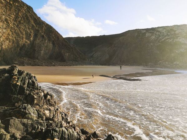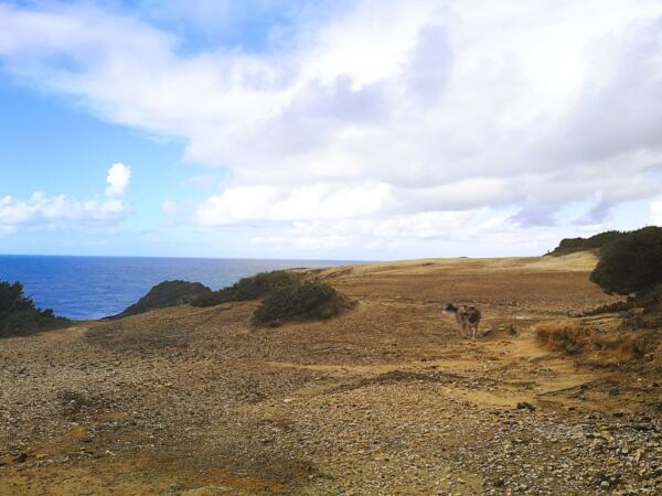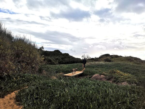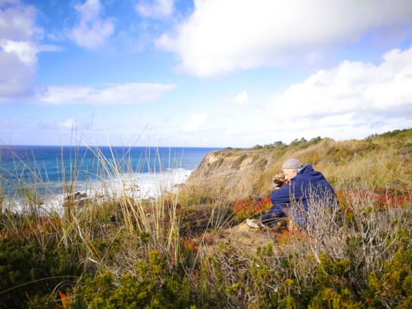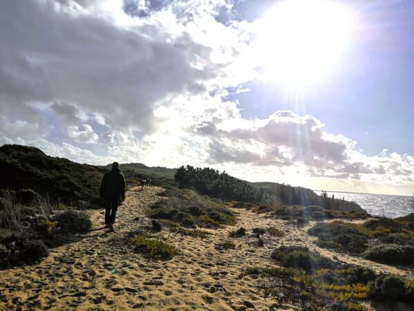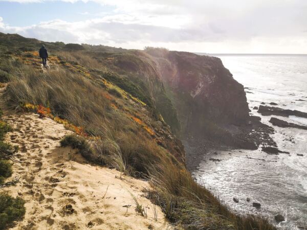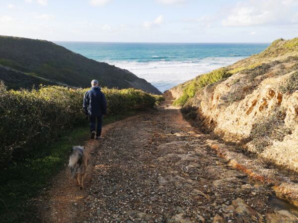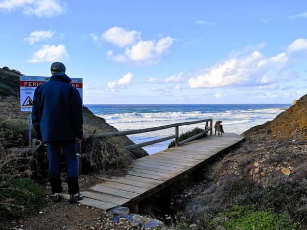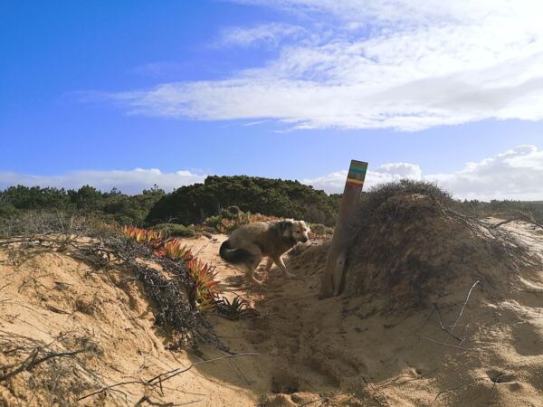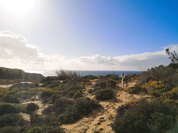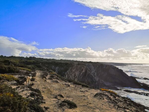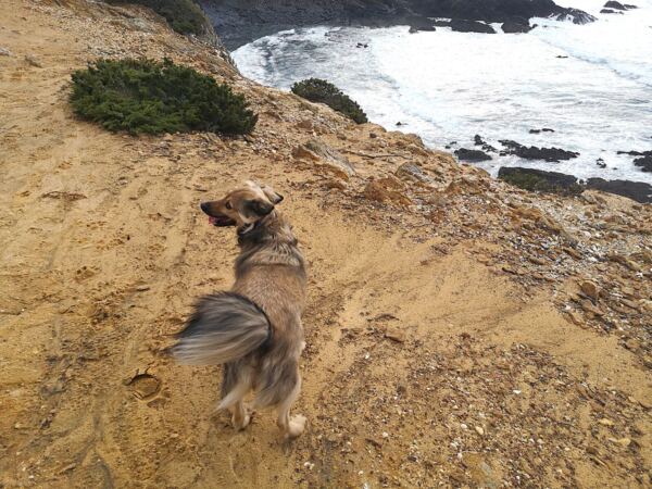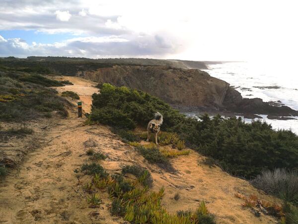 Entlang der Steilküste von Odeceixe verläuft ein Abschnitt des Fischerpfads (Rota Vicentina). Der beliebte Wanderweg führt hier durch eine besonders abwechslungsreiche Landschaft aus bewachsenen Dünen, Klippen und Stränden. Von hier oben bieten sich atemberaubende Ausblicke auf die Küstenlinie und das Meer. Ideal für unseren Amos, der Weitsicht genauso liebt wie wir.