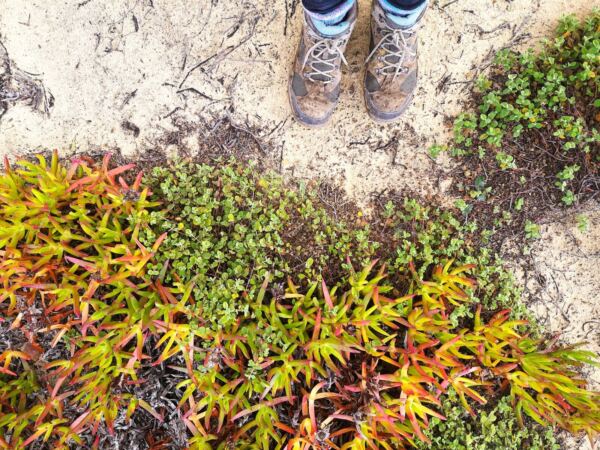 Sukkulenten in Herbstfarben bedecken den Sand.