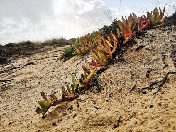 Umgeben von grünen Hügeln und fruchtbaren Tälern liegt der Eingang zur Algarve: Odeceixe. Die Siedlung mit ihren weißen Mauern, roten Dächern und bunten Fensterrahmen blickt auf das breite Delta des Flusses Ribeira de Seixe, der hier in den Atlantik mündet. Er markiert die Grenze zwischen den Regionen Algarve und Alentejo. Die Praia de Odeceixe im Mündungsgebiet gehört zu den schönsten Stränden Portugals. Hier kann man in Süß- und Salzwasser baden. Und auch die Küste von Odeceixe ist wunderschön: dramatische Steilküsten und einsame Buchten, in denen die Wellen des Atlantiks gegen die Klippen tosen. Wir haben uns sofort in diese Kulisse verliebt. 💕🐾🌊 Trotz ihrer Schönheit gilt Odeceixe, keine 15 Kilometer vom bekannteren Aljezur entfernt, noch immer als Geheimtipp. Nur nicht unter Vogelkundler*innen. Denn an der Steilküste nisten Störche, was diese Vögel sonst wohl nirgendwo auf der Welt tun. Wir waren hier im Winter unterwegs, keine Nistzeit. Trotzdem gab es für uns viel zu entdecken, darunter Sukkulenten in verwegenen Farben, wie wir sie nur aus Gärtnereien kennen. Die Region um Odeceixe gehört zum Naturpark Costa Vicentina, das für seine unberührte Natur und reiche Tierwelt bekannt ist.