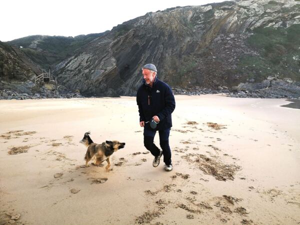 Es geht vorbei an vielen Buchten, von denen die meisten jedoch nur sehr schwer über rutschende Geröllfelder zu erreichen sind. Wer mag, kann immer weiterlaufen, zum Beispiel zur schönen und breiten Praia do Vale dos Homens bei Rogil, die über eine Holztreppe mit dem Fischerpfad verbunden ist. Wir müssen aus Zeitgründen leider vorher umkehren. Neben unserem Parkplatz am Start- und Zielort steigen wir aber noch hinab zum FKK-Strand Praia das Adegas, eine kleine, von Felsen eingefasste Bucht neben der großen Praia de Odeceixe. Traumschön. In der Hauptsaison sind Hunde am Badestrand verboten. In den ruhigen Monaten zwischen Herbst und Frühling lässt hier jeder seine Hunde laufen.