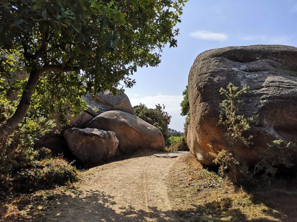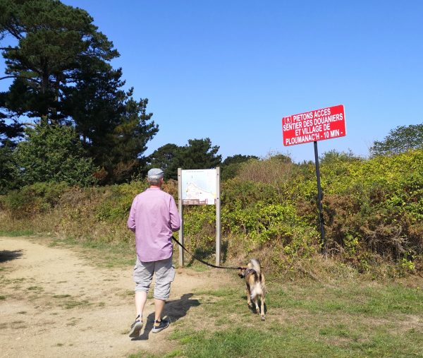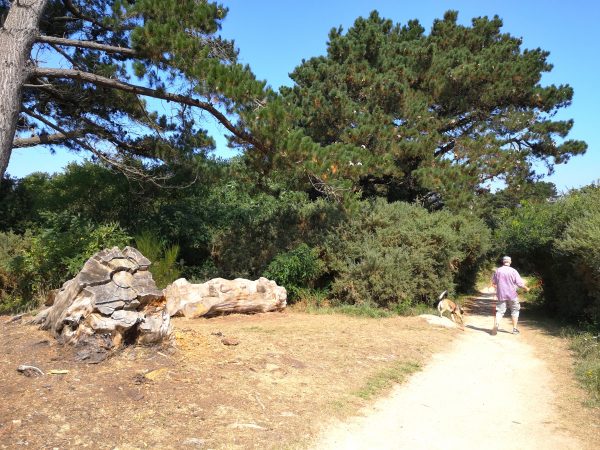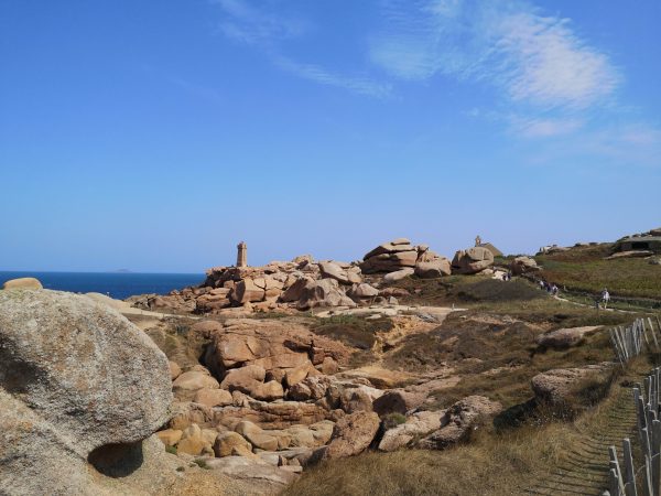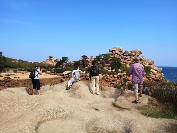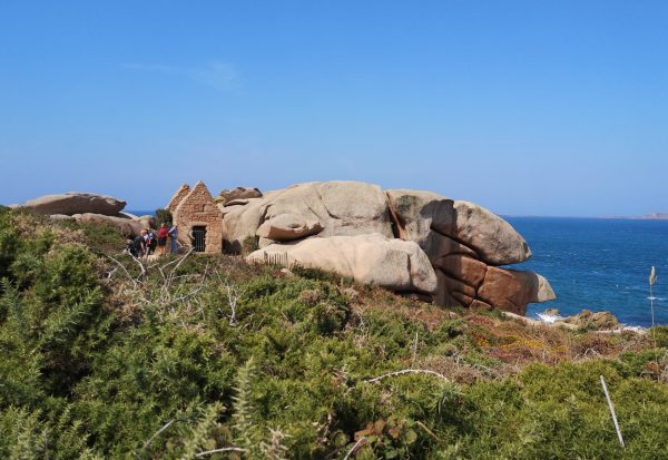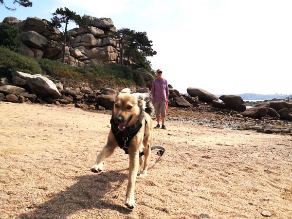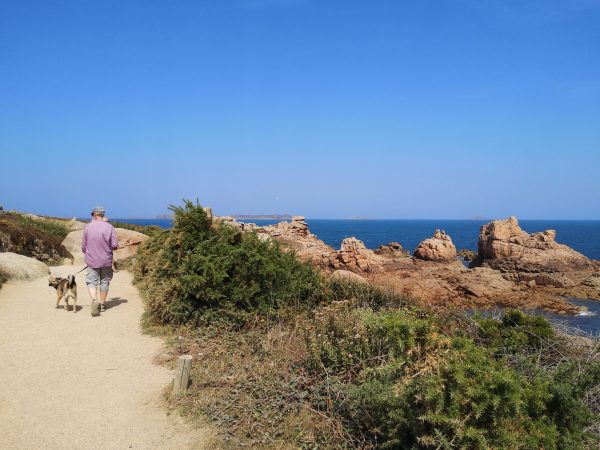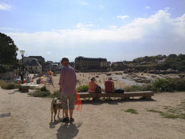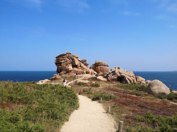 Sie heißen Napoleons Hut, die Hütte der Verliebten oder die Burg des Teufels. Diese 300 Millionen Jahre alten und bis zu 20 Meter hohen rosa Granitgebilde zwischen den Stränden Trestraou und Saint-Guirec genießen Weltruhm. Kein Wunder also, dass viele Touristen gerade in den Sommermonaten auf diesem Abschnitt des bekannten Zöllnerpfads an der bretonischen Küste unterwegs sind. Für Hunde gilt hier Leinenpflicht. Überall in der Bretagne sind wir mit der Schleppleine gut klar gekommen. Hier mussten wir sie meist einrollen, um anderen Wanderern auf dem schmalen Pfad nicht in die Quere zu kommen oder  sie mit der Schleppi zu Fall zu bringen. Trotzdem lohnt sich die Wanderung, die tatsächlich ein Spaziergang ist. Also nichts zum Austoben, sondern zum Staunen. Die Felsenkunstwerke, die das Meer fortwährend umgestaltet, sind absolut sehenswert. Unter Füßen und Pfoten: ein Sandweg. Nur Sonne, kein Schatten. Der Spaziergang lässt sich schön mit einer Einkehr in einer der vielen Cafés, Bars und Restaurants rund um den Strand von Saint-Guirec verbinden.