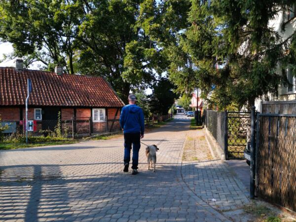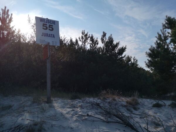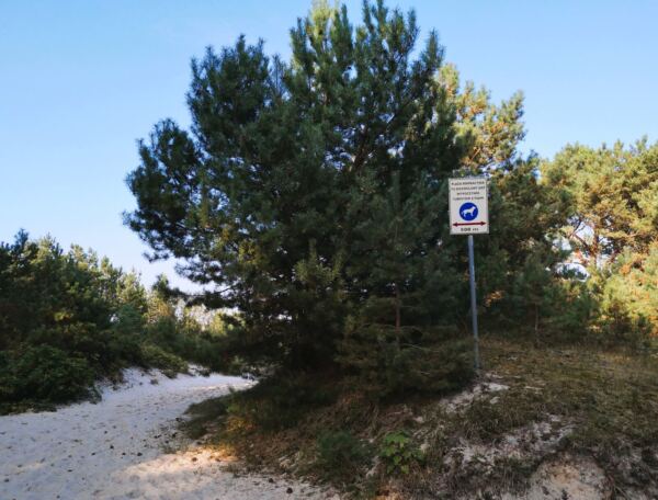 Wir starten unsere Streckenwanderung am stimmungsvollen Hafen von Jastarnia. Gleich nebenan, auf dem trendigen Campingplatz „Molo Surf Camp“, kann man super mit Hund übernachten. Wir laufen am Hafenbecken entlang und überqueren die Hauptstraße. Die Straße Kościuszki bringt uns über die Bahngleise in den Wald. Hier halten wir uns rechts und folgen dem geteerten Fuß- und Radweg immer geradeaus. Bei nächster Gelegenheit wechseln wir vom Teerweg auf den Waldpfad. Hügelauf und -abwärts geht`s immer geradeaus. Für Amos ein Traum. Er gibt in jeder Senke mächtig Gas auf dem weichen Waldboden. Am Strandabgang 55 wechseln wir hinunter an den wunderschönen, feinsandigen Hundestrand, den wir am nächsten offiziellen Strandabgang wieder verlassen. Weiter durch den Wald erreichen wir nach einer guten halben Stunde schon einen Vorposten von Jurata: das Hotel Bryza. Wie luxuriös die bei Promis beliebte Anlage ist, lässt sich von vorne, der dem Meer abgewandten Seite, nicht erahnen.