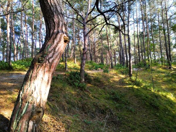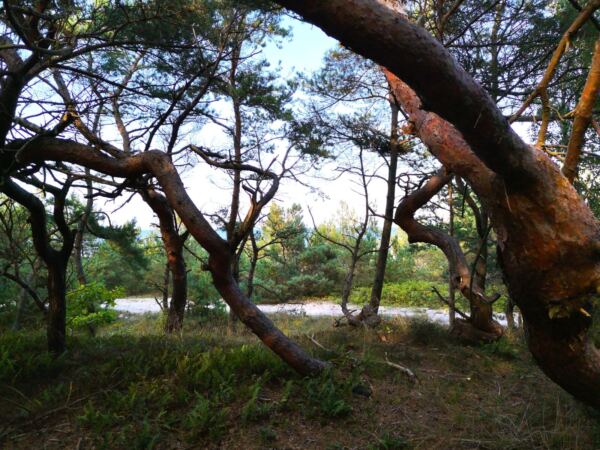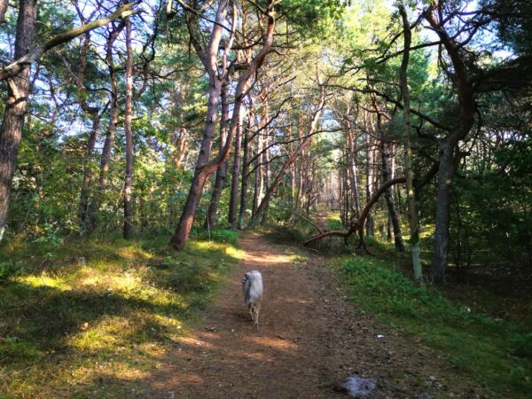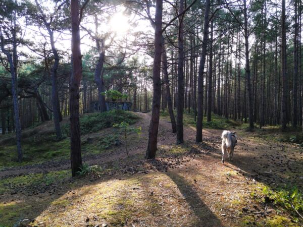Traumschön: der Strandwald zwischen Jastarnia und Jurata. Die Senken bieten sich wunderbar zum Rennen an. Amos hat`s geliebt.