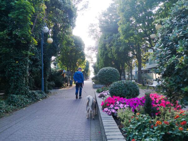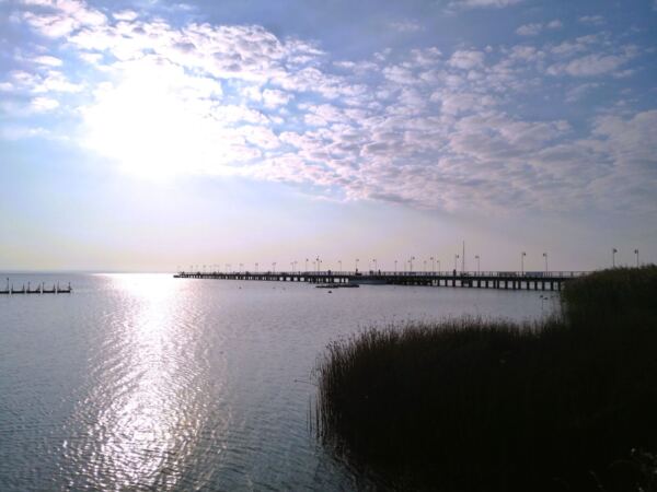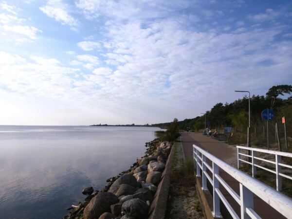 Hinter dem Bryza biegen wir rechts ab und folgen der Straße über die Eisenbahnlinie. Wir überqueren die Hauptstraße und laufen weiter geradeaus über die breite, für den Verkehrt gesperrte Allee zur Mole von Jurata. Nach einigen Metern entlang der schönen Promenade und einer Kaffeepause geht es auf demselben Weg zurück.