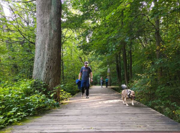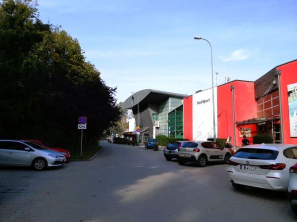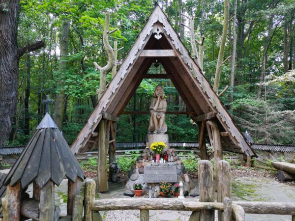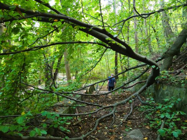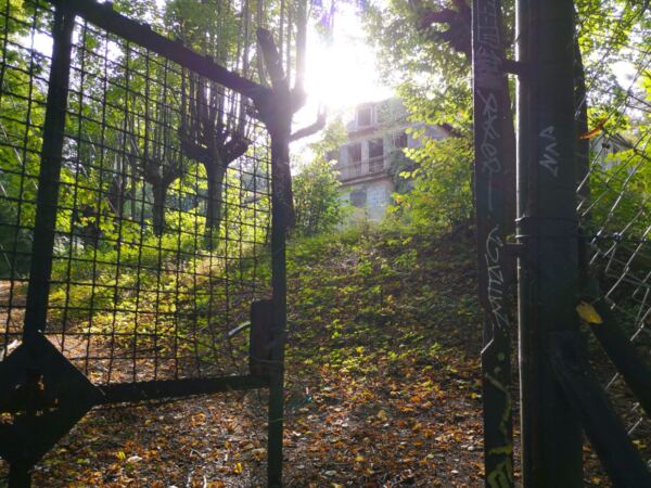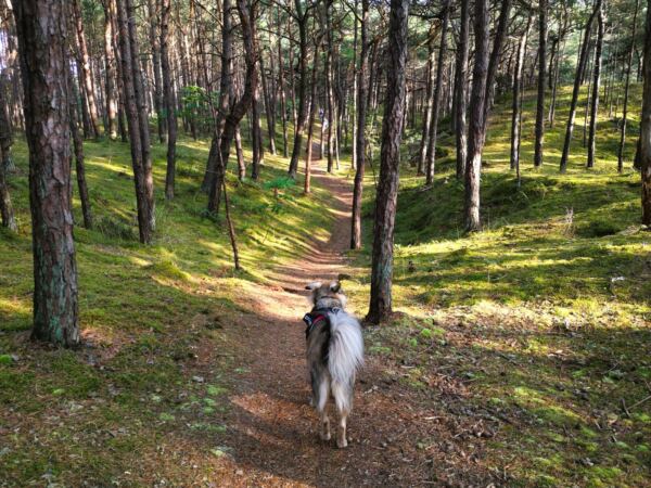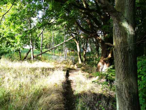 Ausgangspunkt unseres Stadtspaziergangs ist der Campingplatz Metropolis, am Waldrand gelegen. Hier kann man übrigens auch kleine Ferienhäuschen mieten, in denen Hunde erlaubt sind. Vom Campingplatz laufen wir Richtung Tankstelle. An der nächsten Kreuzung biegen wir an einer Pizzeria links ab. Auf der Straße Sepia halten wir uns bergab. An der nächsten Kreuzung könnten wir weiter geradeaus und bergab direkt in den Strandpark laufen. Wir entscheiden uns für den abenteuerlicheren Weg – und biegen links ab auf die Straße Zamkowa Góra. Wir laufen vorbei am großen Spa. Kurz bevor unsere Straße vor einem Bauzaun in eine Sackgasse mündet, geht rechts ein gut sichtbarer Trampelpfad in den Wald ab. Ihm folgen wir. Zunächst einige Schritte bergab, dann links. Der nun sehr schmale Waldpfad bringt uns nach einigen Metern vorbei an der Umzäunung, die Eindringlinge von den Ruinen des „Bergschlosses am Menzelberg“ fernhalten soll. Die alte Schönheit des Schlösschen, mehr Herrenhaus als Schloss, ist noch zu ahnen. Doch der Zahn der Zeit hat schon große Löcher in das Dach und die Mauern gebissen. Hoffentlich rettet noch jemand das Schlösschen, bevor es in die Knie geht. Hinter dem Bergschloss führt eine uralte, ebenfalls sehr mitgenommene Treppe bergab. Amos macht es Riesenspaß, über Stufen und umgestürzte Bäume nach unten zu flitzen. Die Treppe mündet auf den Fahrradweg im Strandpark. Wir wechseln hinüber auf den Wanderweg für Fußgänger und halten uns links.