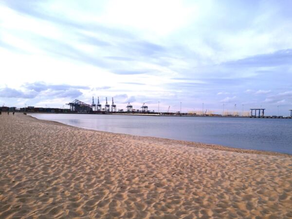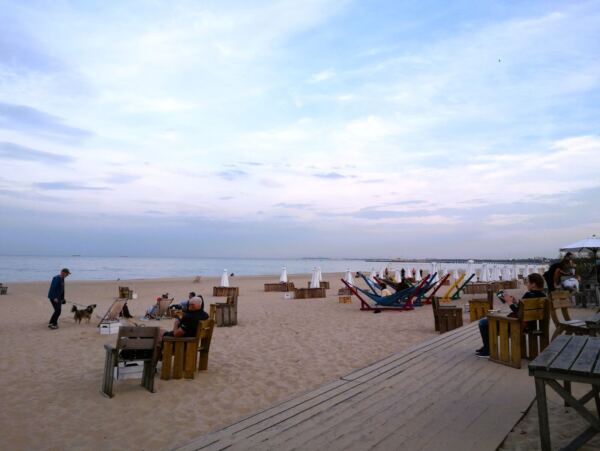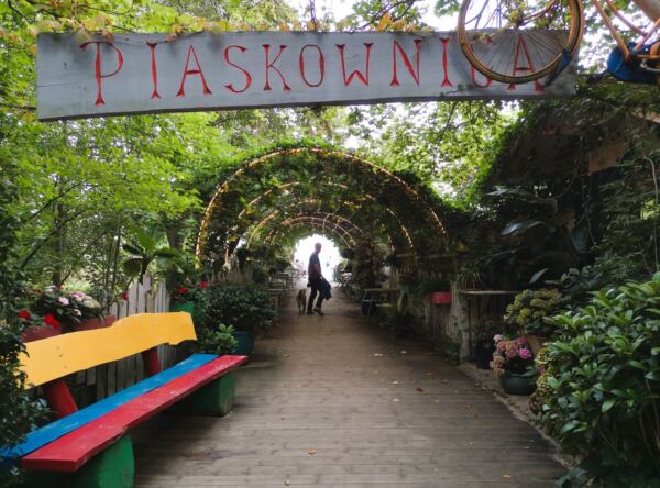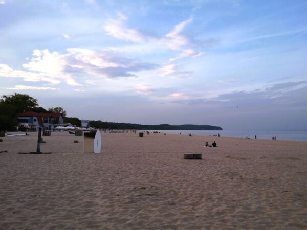 Nach einer ausgiebigen Plansch- und Spielpause laufen wir nun in die Gegenrichtung zurück in den Strandpark. Ab jetzt geht es immer geradeaus. Der Weg verläuft in Spuckweite zum Strand unterm Blätterdach mächtiger Buchen. Viele Jogger, Nordic Walker, Spaziergänger mit und ohne Hund sind hier unterwegs. Die besondere Feierabendstimmung – heiter, gelöst – lässt sich fast mit Händen greifen. Etwa auf halben Weg vor der Seebrücke liegt das Café und Restaurant Piaskownica. Schon der Zugang – ein begrünter Tunnel – ist so schön, dass etliche Vorbeilaufende ein Foto machen. Wir entscheiden uns nicht für den herrlich bunten Gastgarten, sondern die Sitzgelegenheit am Strand. Hier hocken wir bestimmt eine Stunde und genießen die Stimmung. Familien und Paare liegen in Hängematten, lesen und plaudern. Dazwischen hüpfen einige Hunde umher, die zu diesem Strandabschnitt in der Hauptsaison eigentlich keinen Zugang haben. Stört aber niemanden. Über den Strand verteilt stehen Klappstühle und Sonnenschirme. Manche haben die Stühle direkt zum Spülsaum getragen und warten dort, die nackten Füße in der Ostsee, auf den Sonnenuntergang.