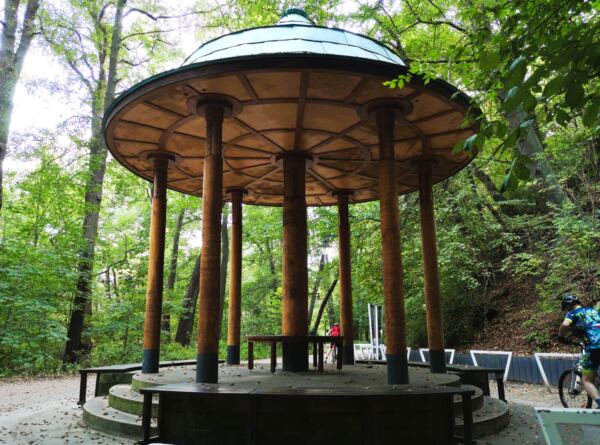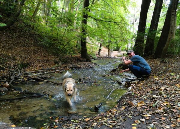 Über den Sumpf bringt uns ein Bohlenweg, dann stehen wir bald an einem zauberhaften Ort mit einem Pavillon aus Holz: der Kollath Gazebo (auch Altana Kollatha). Der Pavillon ist ein Nachbau. Das Original wurde 1908 zur Erinnerung an den Bürgermeister von Sopot, Johanes Kollath, errichtet. Hinter dem Tempel stürzt sich die Swelinia strudelnd zu Tal. Amos tankt im Bach, der wenige Meter weiter ins Meer mündet, direkt mal auf. Über die Swelinia laufen wir weiter geradeaus zum Strand. Wir halten uns am Waldsaum, der hier übergangslos einfach in den Sand übergeht, und erreichen wenig später den tiefen Hundestrand mit wunderschönem Blick auf die Steilküste und die ersten Häuser von Gdynia.