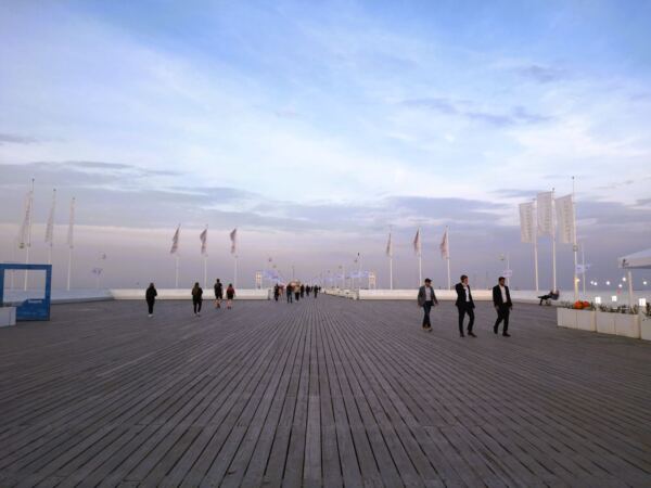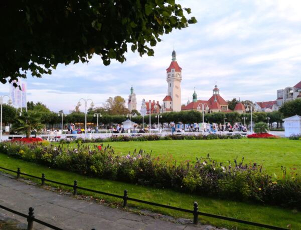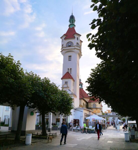 Wir reißen uns los und laufen immer weiter geradeaus zur Seebrücke. Bogenförmige Wandelhallen umgeben den Vorplatz Skwer Kuracyjny. Zwischen prächtigen alte Villen und dem Türmchen-bestückten Warmbad erhebt sich der Leuchtturm. Neben den Blumenrabatten dreht sich ein nostalgisches Kinderkarussell, Pärchen laufen im Abendlicht Arm in Arm an uns vorbei, hinaus auf die Seebrücke. Was für eine Stimmung! Man könnte fast romantisch werden, wäre da nicht Amos. Dem ist der Geruch nach Waffeln, gebrannten Mandeln und sonst noch allerhand in die Nase gestiegen. Er vergisst jede Erziehung und hängt sich in die Leine Richtung Süßkram.