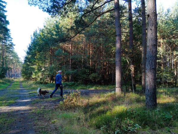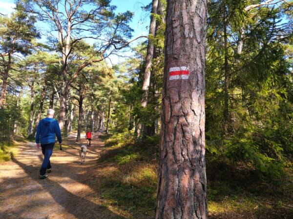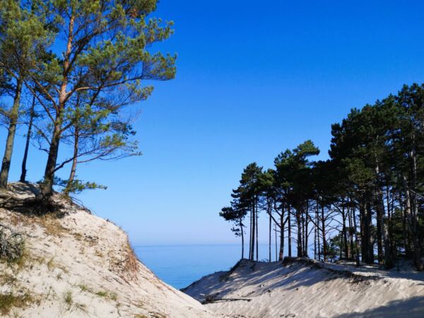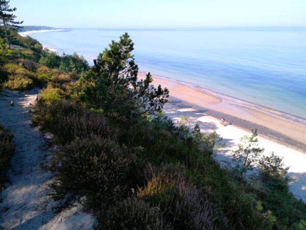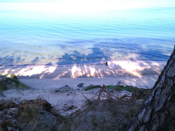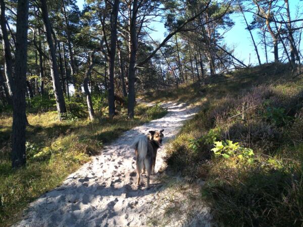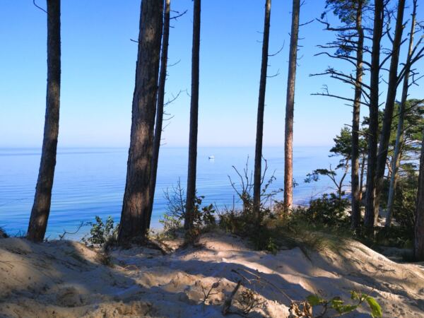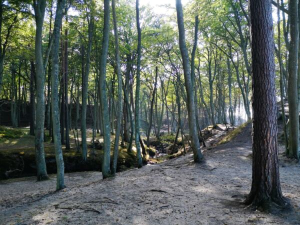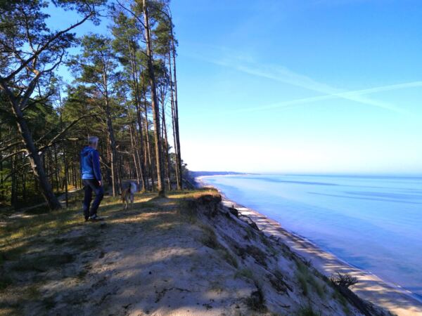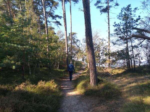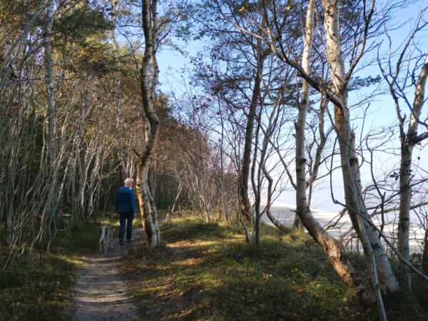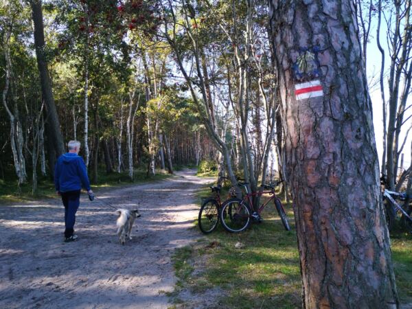Richtung Ustka wird der Strand breiter, und auch das Steilufer fällt ab. Im Strandwald vor Ustka sind wir dann auf Meereshöhe. Hier beginnen auch die breiten Badestrände, die in der Hauptsaison für Hunde gesperrt sind. Wir laufen an den Stränden vorbei durch den Wald.