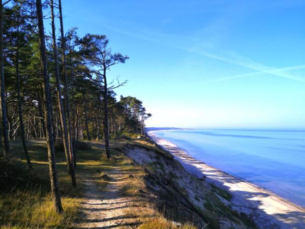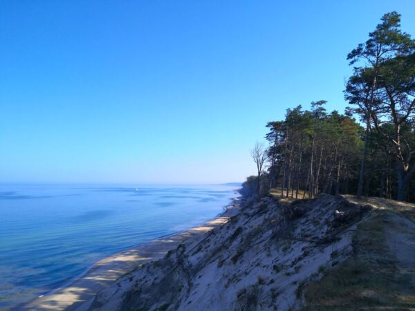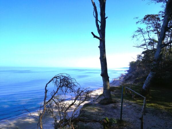 Los geht`s in direkter Nachbarschaft des Campingplatzes auf dem großen Wanderparkplatz an der Zufahrt nach Orzechowo. Dort lässt sich auch ein WoMo problemlos parken. Gefühlt sind wir hier schon mitten im Nirgendwo. Vom Parkplatz halten wir uns Richtung Ortsausgang und wechseln auf den breiten Forstweg, der links von der Zufahrtstraße abzweigt. Nach einigen Metern geradeaus biegen wir rechts ab Richtung Meer – und finden uns wenig später am Aussichtspunkt auf dem Steilufer. Der Ausblick ist wunderschön-dramatisch. Das Ufer fällt steil ab. Auf dem schmalen Sandstrand liegen uralte Baumstämme, die Sturmfluten freigelegt haben. Dazwischen sind einige wenige Menschen unterwegs, die meisten mit Hund. Wir halten uns links und folgen dem schmalen Pfad in sanftem Auf und Ab entlang der Steilküste. An diesem Blick können wir uns gar nicht sattsehen.