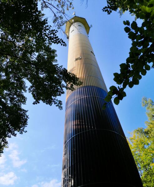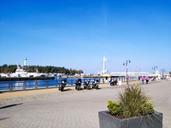 Der Wald lichtet sich. Wir halten uns rechts und stoßen auf eine geteerten Fußgängerweg. Er bringt uns vorbei an Strandbuden und Ferienanlagen und schließlich auf die schöne Promenade, die von Cafés, Kneipen und einigen historischen Fassaden gesäumt wird. Man merkt bald: Im zweiten Weltkrieg ist Ustka weniger zerstört worden als die meisten Orte an der polnischen Ostsee. Wir erreichen den stimmungsvollen Hafen. Hier mündet die Stolpe ins Meer. Am frisch renovierten Hafenkai lässt es sich wunderbar aushalten. Vor uns die die eleganten Drehbrücke, Fischkutter und Jachten, hinter uns der historische Leuchtturm.