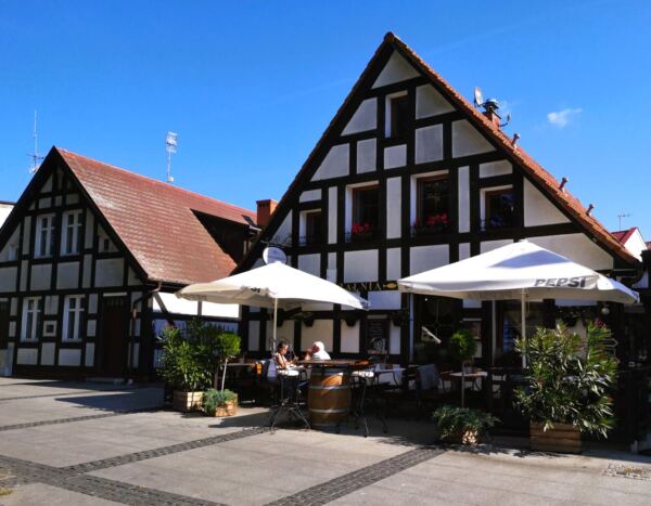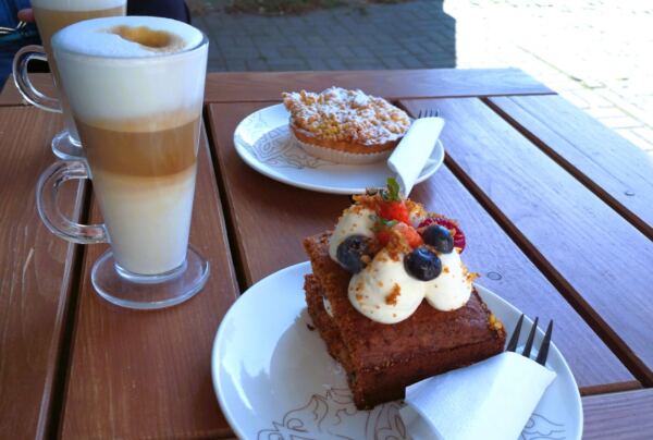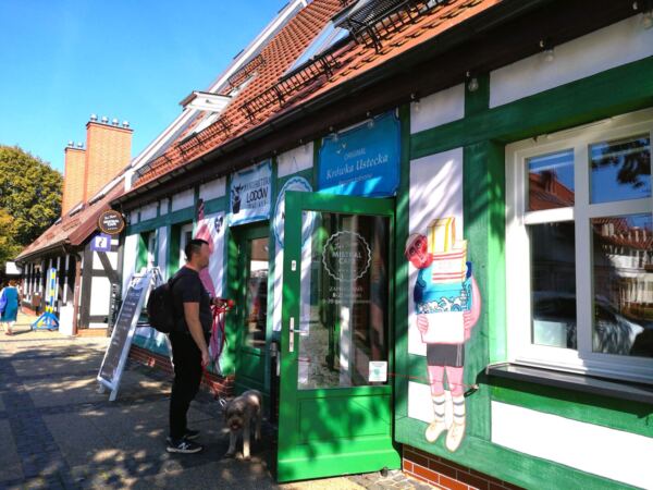 Wir laufen an der Stolpe entlang in die Innenstadt – und finden uns bald wieder im Kapitänswinkel. Hier standen die Ruhesitze vieler Kapitäne und Seeleute. Manche der Fachwerkbauten blieben erhalten, andere wurden im gleichen Stil neu errichtet. Wir laufen kreuz und quer durch die Gassen und machen schließlich Pause auf der kleinen Terrasse des „Mistral Cafe“ (Kaszubska 9) mit seiner liebevoll bemalten Fassade. Die hausgemachten Kuchen, Pralinen und mehr sind unfassbar lecker.