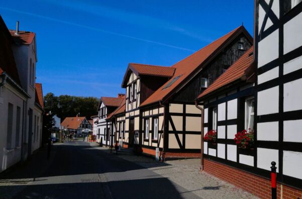 Am Eingang zum Kapitänswinkel. Viele Häuser sind im Fachwerkstil neu erbaut.