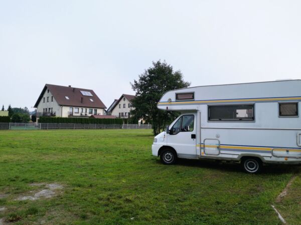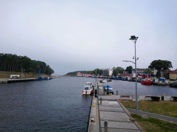 Wir starten in Mrzezyno am Parkplatz an der Straße Kolobrzeska. Hier lässt sich auch ein kurzes WoMo abstellen. Diese Hauptstraße bringt uns auch zur Brücke über die Rega. Rechts von uns liegt der kleine Hafen mit Cafés und Fischrestaurants, vor uns der neue Leuchtturm von Mrzezyno. Hinter der Brücke folgen wir noch einige hundert Meter der Straße, die bald in Kopfsteinpflaster übergeht. Wir nutzen die nächste Gelegenheit und biegen rechts ab auf den Waldweg. Nach einigen Metern geradeaus halten wir uns links.