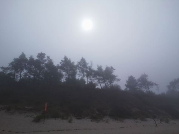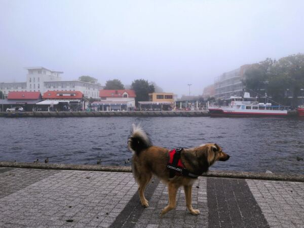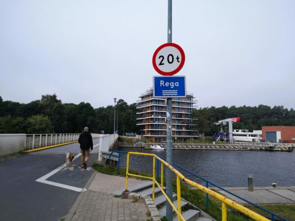 Durch den Nebel wandern wir am Strand entlang und haben fast das Gefühl, aus Zeit und Raum gefallen zu sein. Unwirklich und ziemlich großartig. In rund 2 Stunden begegnen uns gerade mal 5 Menschen und 3 Hunde. Dann stehen wir an der Hafenmole (mit Wohnmobilstellplatz) in Mrzezyno. Durch den Hafen laufen wir zurück zur Brücke über die Rega und weiter zum Ausgangsort. Die Einkehr im Hafen schenken wir uns heute. Sieht aber aus, als könne man hier sehr schön sitzen.