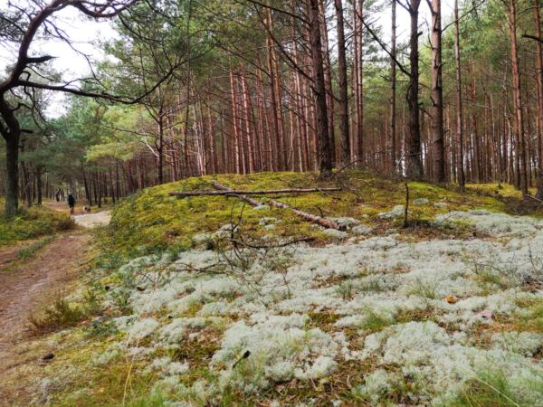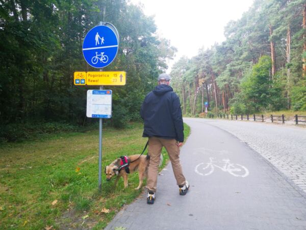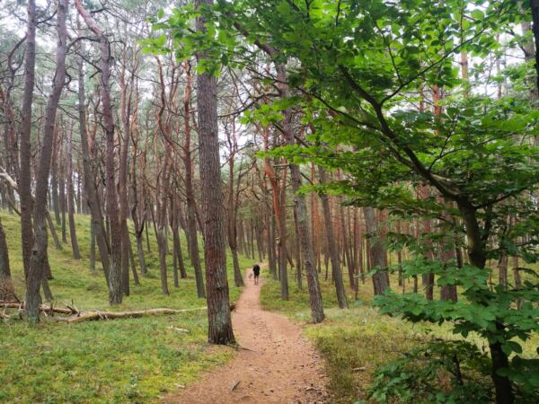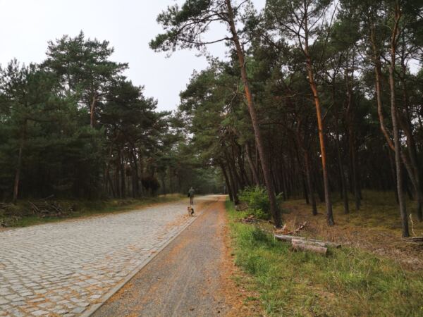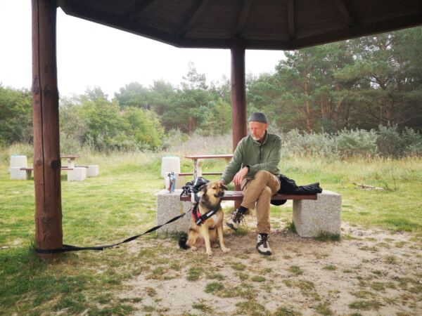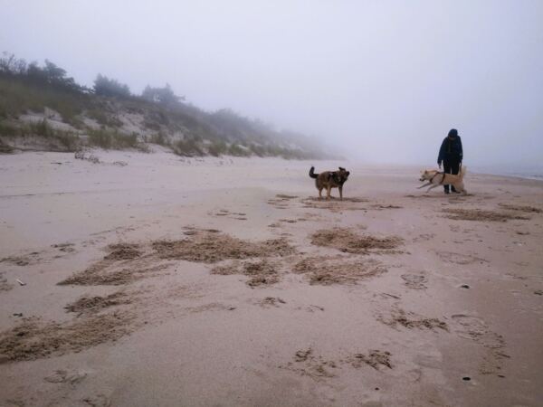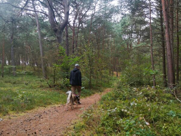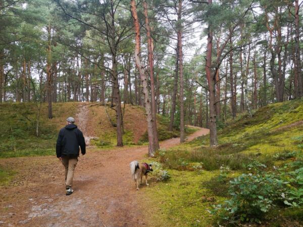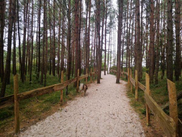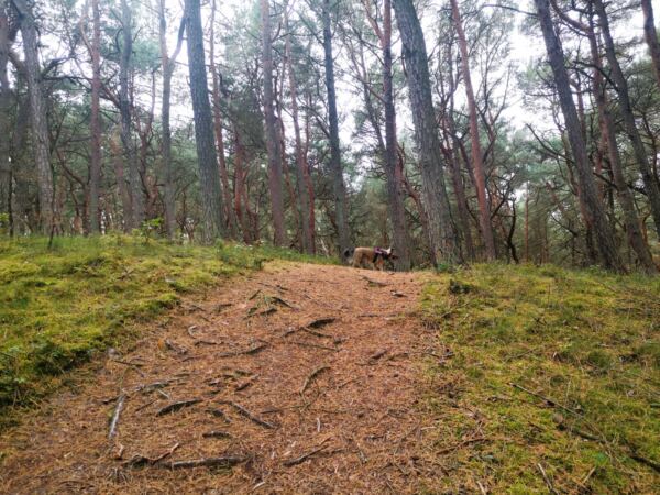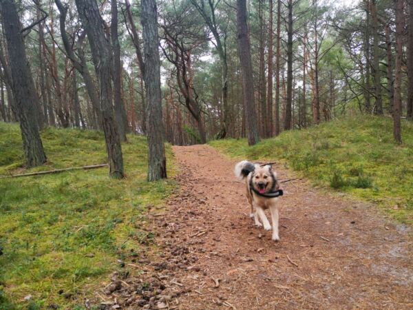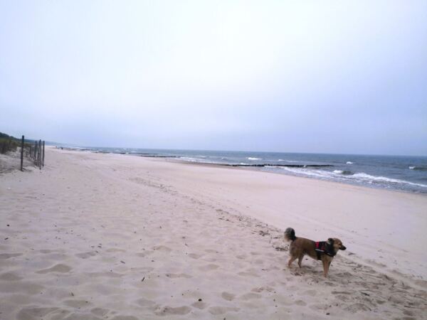 Zwischen den Badeorten Mrzezyno und Pogorzelica erstreckt sich ein wunderbarer Küstenwald. Durch das Dach von Kiefern und Eichen dringen Sonnenstrahlen. Sie tanzen über Hügel und Senken, setzen der Heide Lichtpunkte auf und lassen die Moose glitzern, die hier in allen Schattierungen zwischen dunkelgrün und silbergrau gedeihen. Es riecht nach Harz und klingt nach weit ab vom Schuss – nur Vögel zu hören. Den Wald säumt ein ebenso schöner naturbelassener Sandstrand. Extra freigegebene Strandabschnitte für Hunde gibt es hier nicht. Mit Vierbeiner kann man einfach durchlaufen. Zur Hochsaison ist vergleichsweise wenig los. Jetzt, gegen Ende der Saison, gehört uns der Strand fast ganz allein. Ein Traum für ruhesuchende Naturfans mit Hund.