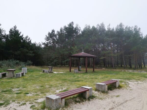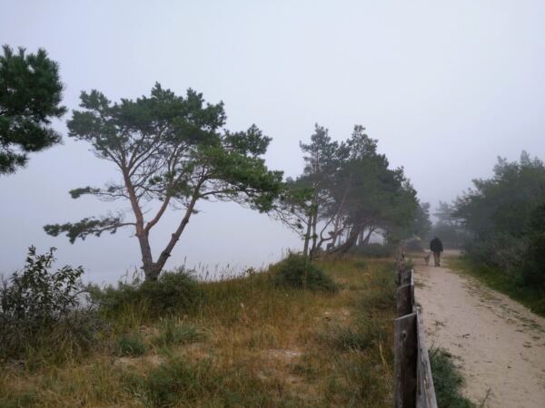 Ab hier geht es nun immer geradeaus in sanftem Auf und Ab durch den märchenhaften Wald. Amos ist ebenso begeistert wie wir, tobt die Hügel hinauf und hinunter. Nach gut 1 ½ Stunden – Zeit verliert hier rasch jede Bedeutung – erreichen wir einen gepflasterten Platz. Den linken Abzweig mit dem Wegweiser Richtung Pogorzelica ignorieren wir. Stattdessen folgen wir dem (bei Radlern wegen seines wilden Kopfsteins wenig geschätzten) Radweg in unserer bisherigen Laufrichtung. Wenig später biegt von diesem breiten Weg (dojazd pozarowy 32) rechts ein Wanderweg ab. Wir folgen ihm und erreichen bald den eingezäunten Aussichtspunkt an der recht niedrigen Steilküste. Leider hat sich mittlerweile eine dichte Nebelsuppe zusammengebraut. Vom Aussichtspunkt reicht unser Blick nur ein paar Meter weit. Trotzdem sehr schön hier. Nach einer kurzen Rast unter dem Dach der Schutzhütte nehmen wir den Abgang vom Aussichtspunkt hinunter zum Naturstrand.