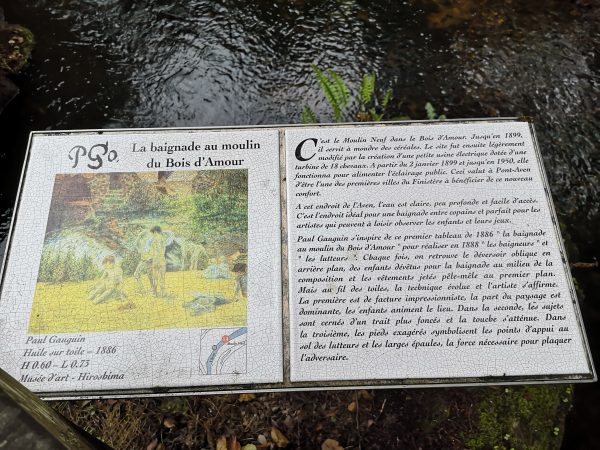 Am Mündungstrichter des Aven in den Atlantik liegt der malerische Ort Pont-Aven. Der brachte es bereits Ende des 19. Jahrhunderts zu einiger Berühmtheit, nachdem sich hier eine Künstlergruppe – später bekannt als Schule von Pont-Aven – um die Impressionisten Paul Gauguin und Émile Bernard eingefunden hatte und das Städtchen und seine Umgebung in ihren Bildern verewigte. Neuerliche Berühmtheit bescherte dem Ort Monsieur Dupin. Der Krimi-Kommissar, erdacht von Jörg Bong (Pseudonym Jean-Luc Bannalec), ermittelt gleich im ersten Band „Bretonische Verhältnisse“ in Pont-Aven. Pont-Aven lässt sich auf den Spuren von Gauguin, Dupin und vor allem hundegerecht erkunden. Wer am Parkplatz des mittlerweile geschlossenen Museums für zeitgenössische Kunst an der Rue de la Belle Angèle 10 startet, kann den Bummel zunächst mit einem Gassigang durch den Bois de Armor beginnen.