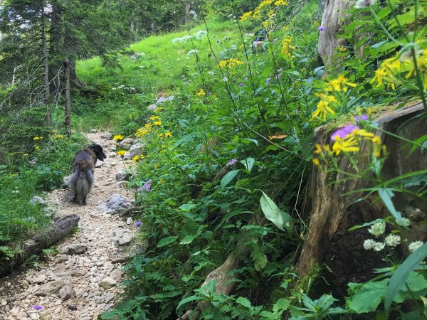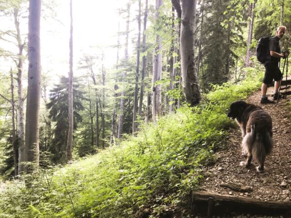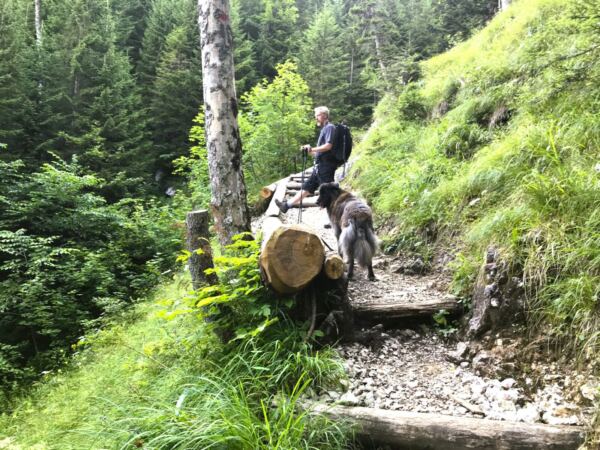 Unser Weg führt in den Wald hinein und wir nun steinig-wurzelig. An den sumpfigen Stellen – hier plätschert ein Wasserlauf – sorgen Eisengitter dafür, dass wir nicht im Matsch versinken. Unser Hund kann sie problemlos umlaufen. Über Stock und Stein geht’s durch lichten Wald recht steil bergab. Schließlich erreichen wir den Spitzingsattel.