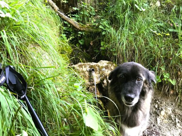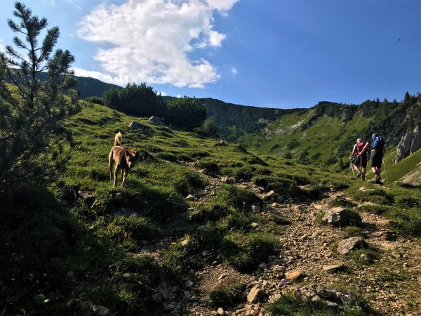Am Eingang zum Kessel, in dem die Jägerbauernalm liegt. Der Hund der Sennerin bleibt auf Abstand.