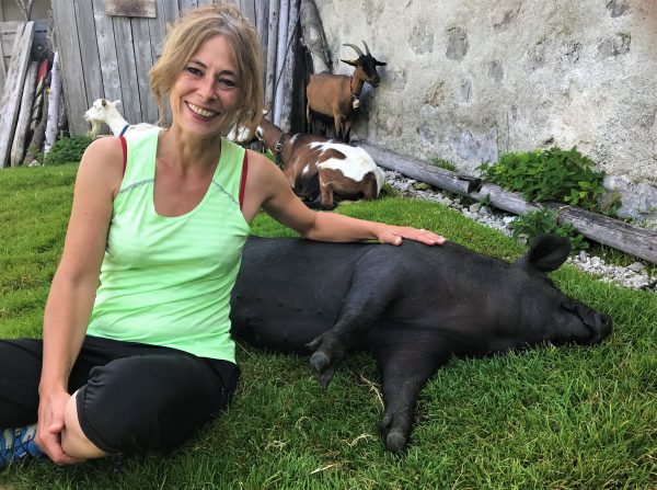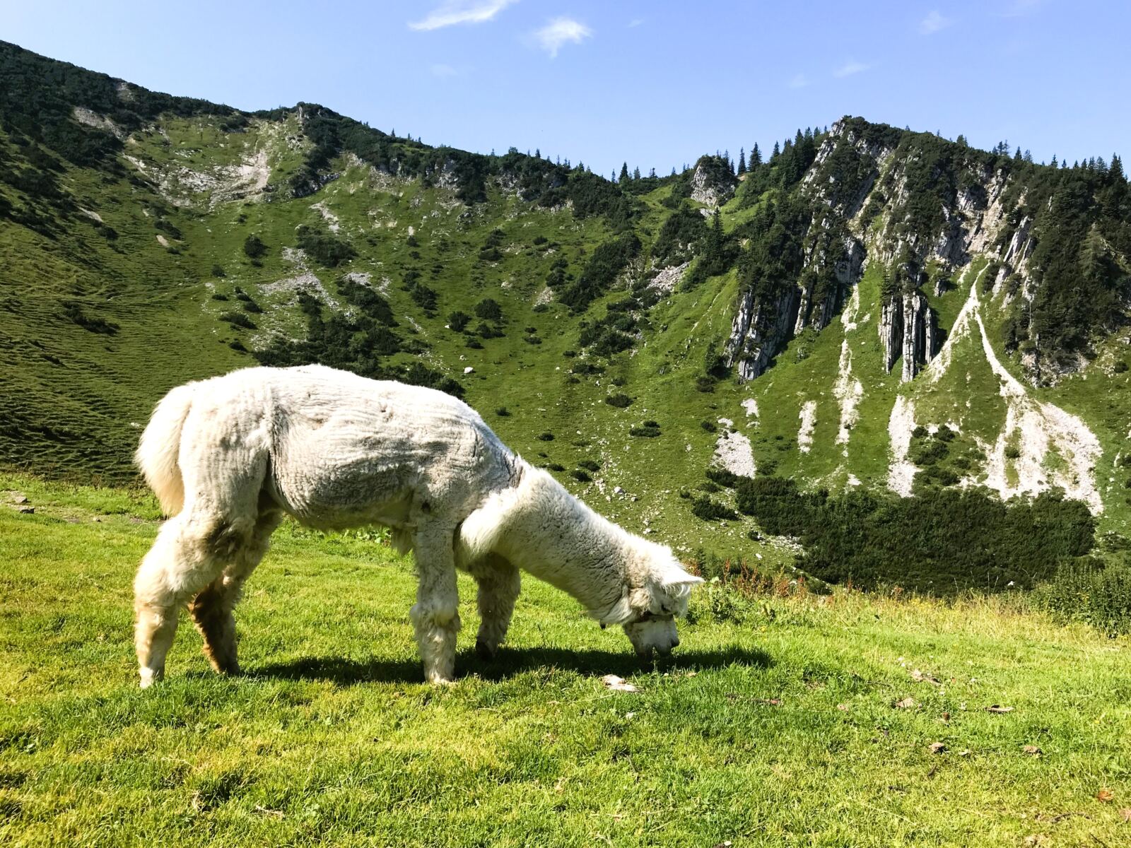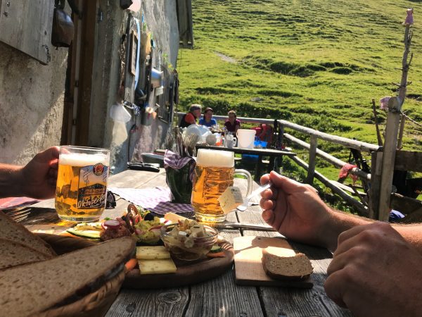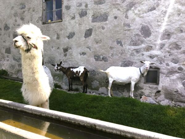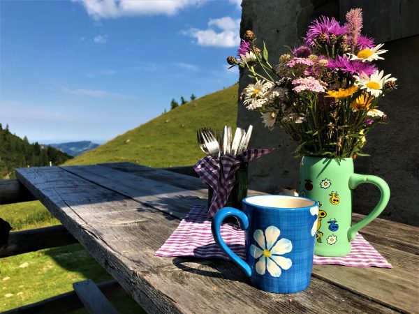 Wir nehmen unseren Hund an die Leine und steigen am Rand des Kessels über die Wiese bergauf. Tramschön dieser Blick auf die grasbewachsene Mulde, im Halbkreis umstanden von latschenbewachsenen Felswänden. Schon von weitem sehen wir das Lama – ein weißer Farbklecks im Grün. Auf der Alm gönnen wir uns eine ausgiebige Rast mit Brotzeitbrett und guten Gesprächen. Hier kommt man schnell ins Plaudern – mit der Sennerin genauso wie mit ihren Gästen.