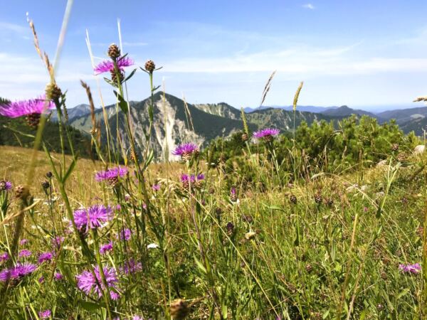 Weiter geht’s. Wir laufen vorbei an der Alm und halten uns rechts, der Beschilderung Richtung Jägerkamp folgend. Eine knappe halbe Stunde wandern wir moderat bergauf über den Rücken des Jägerkamps. Der Pfad bringt uns zwischen Latschen, bewimperten Alpenrosen und Polstern von zartrosa Leimkraut zum Gipfel – mit grandiosem Bergpanorama zu beiden Seiten. Unter dem Gipfelkreuz machen wir eine ausgedehnte Genießerpause. Traumblicke über Senken und Höhen in alle Himmelsrichtungen: im Norden über das Alpenvorlang nach München, im Westen über die Tegernseer Bergen mit Roß- und Buchstein, nach Osten zu den Chiemgauer Alpen und nach Süden über die Schlierseer Berge nach Tirol. Aus der Ferne grüßen uns die Gipfel von Zillertaler und Kitzbüheler Alpen.