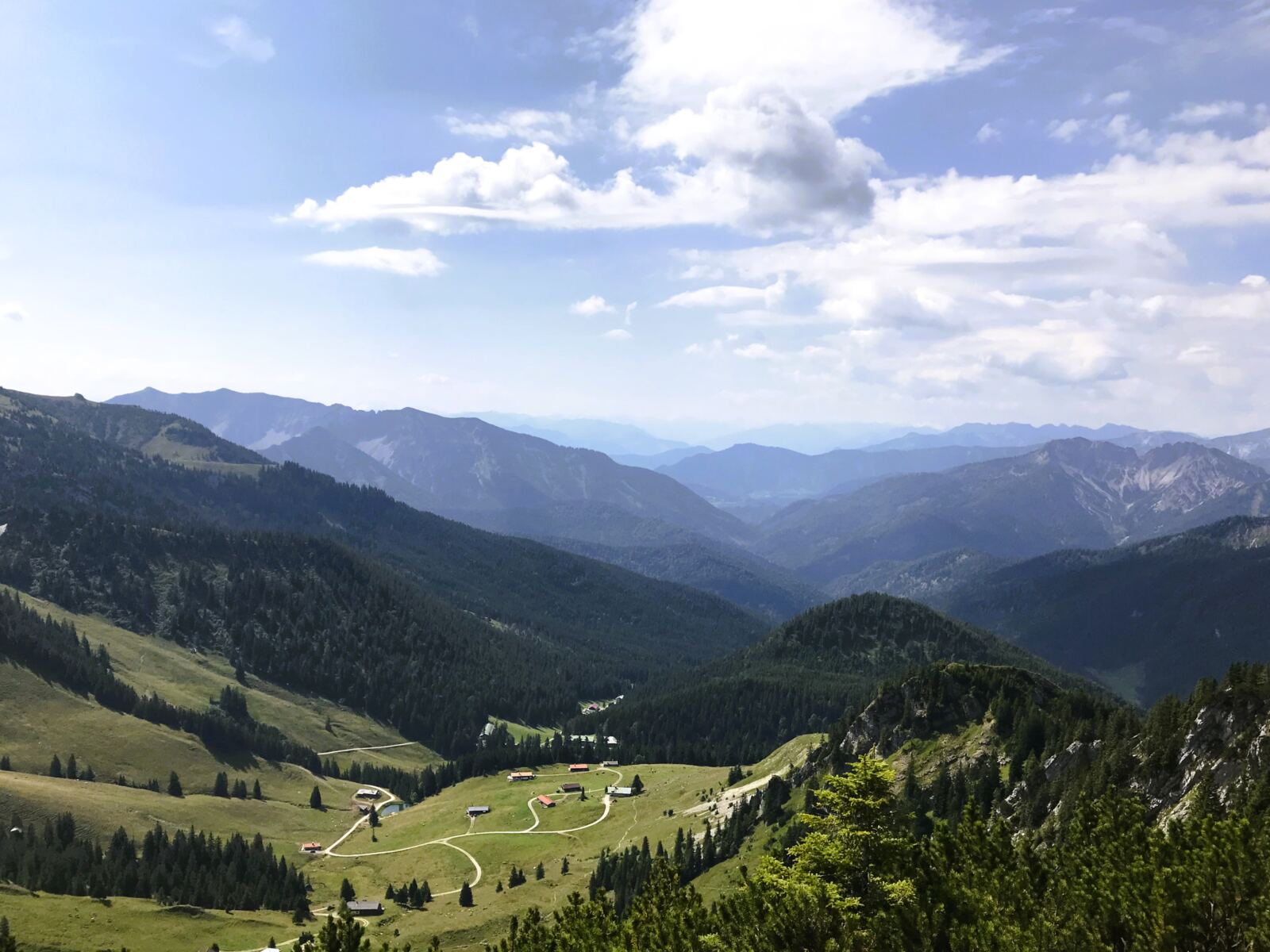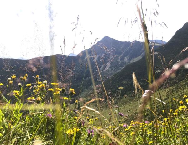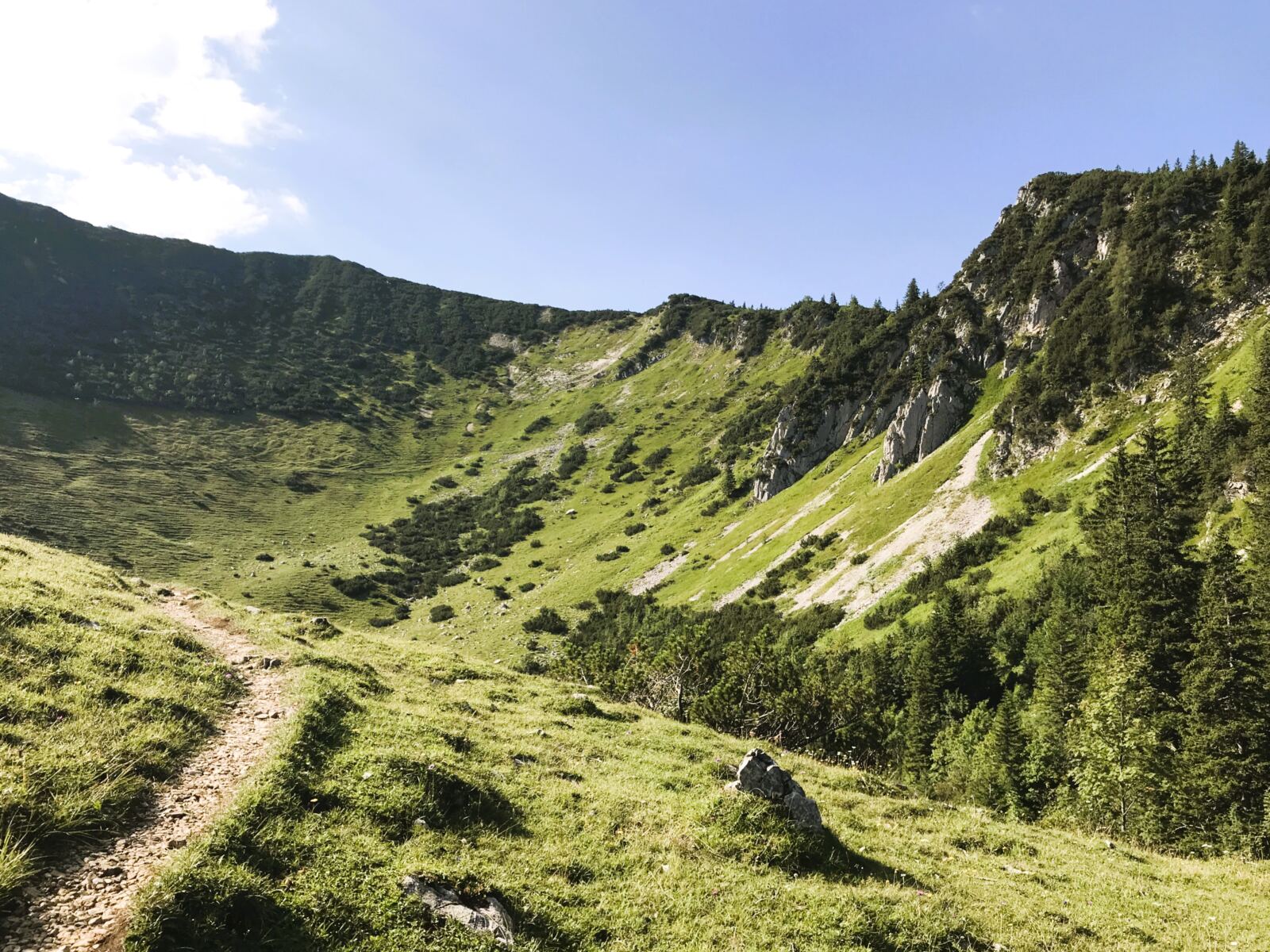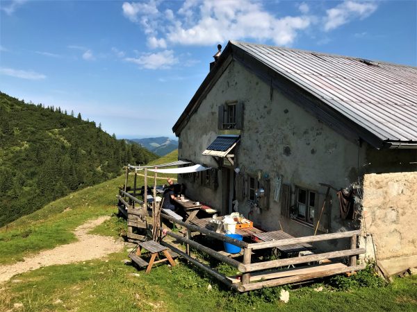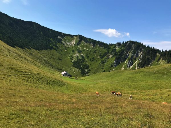 Weiter geht`s. Unter uns, der Jägerbauernalm gegenüber, sehen wir schon unser nächstes Etappenziel: die Schönfeldalmen, darunter die Schönfeldhütte. Wer mag, kann vom Gipfel des Jägerkamps auf einem schmalen Latschenpfad hinüber zum Gipfel der Wilden Fräulein laufen. Wir machen uns direkt an den Abstieg. Wir folgen dem Pfad durch offenes Gelände bergab in die Wiesensenke Richtung Schönfeldhütte. Er führt uns zunächst geradeaus Richtung Süden unter dem Gipfel der Benzingspitz (1.735 m) entlang. An der nächsten Kreuzung halten wir uns rechts und steigen weiter gemütlich bergab, vorbei an den Schönfeldalmen. Wenig später erreichen wir die Schönfeldhütte mit Sonnenterrasse und sehr guter Küche. Wer mag, könnte hier also noch einmal einkehren. 😊