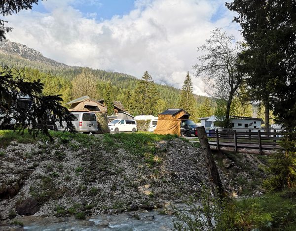 Ausgangspunkt unserer Tour: Der Caravanpark Sexten, wunderbar eingebettet in die Natur und Blick auf die Sextener Dolomiten.