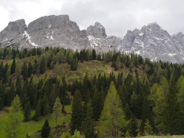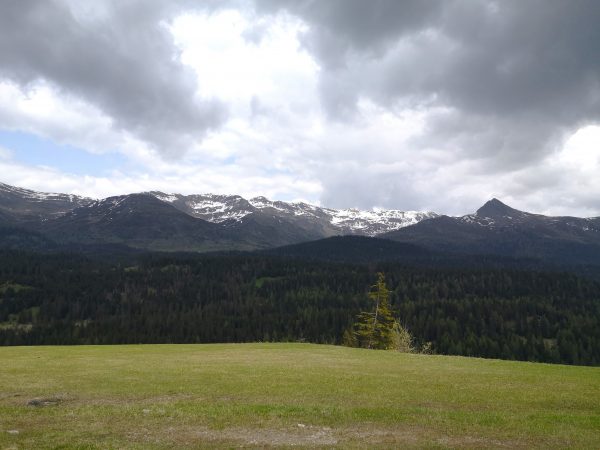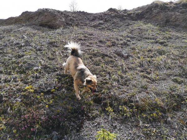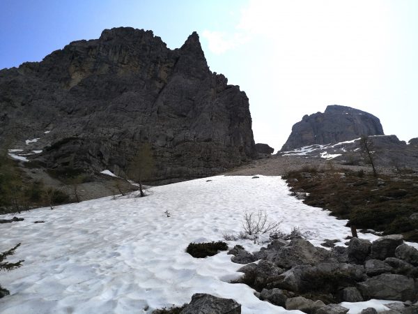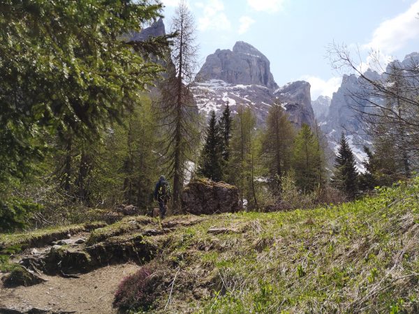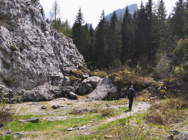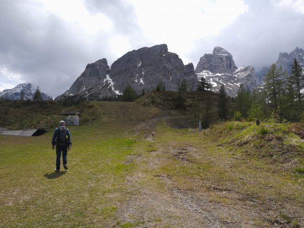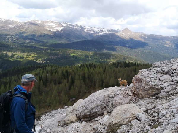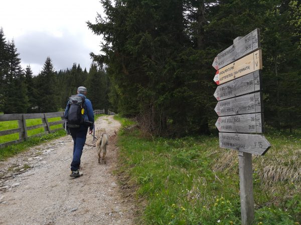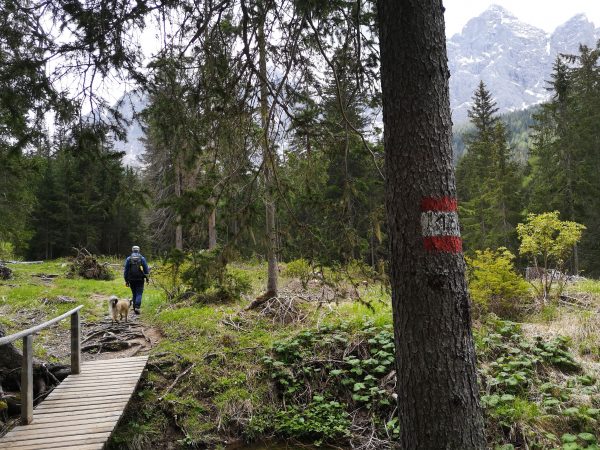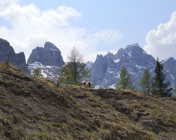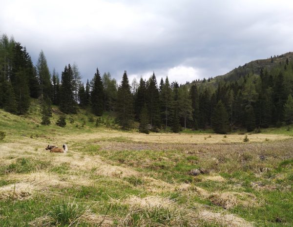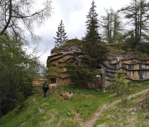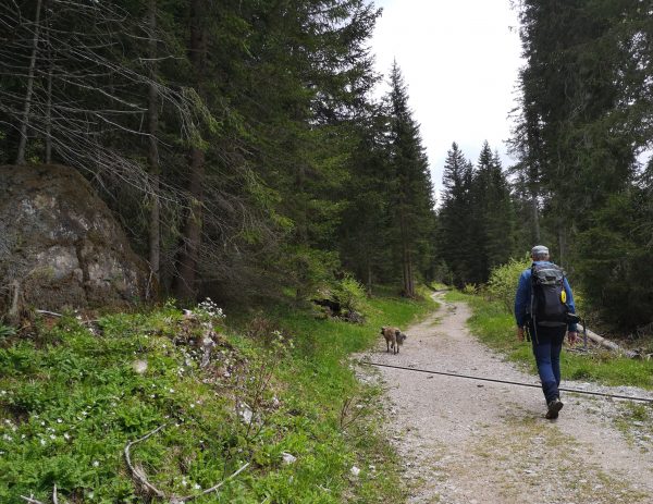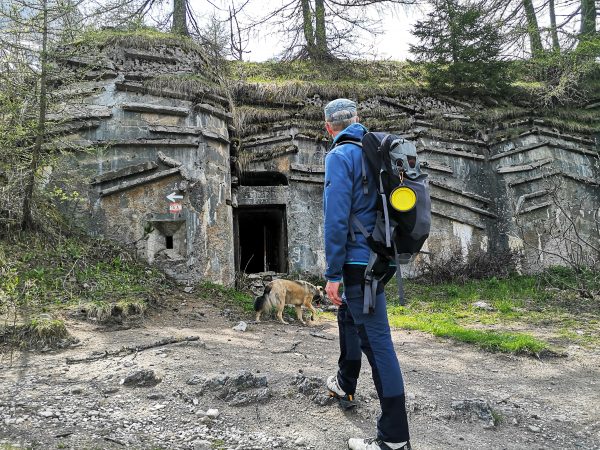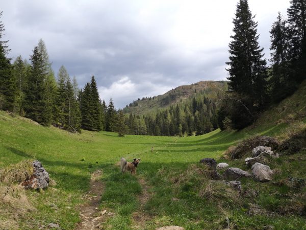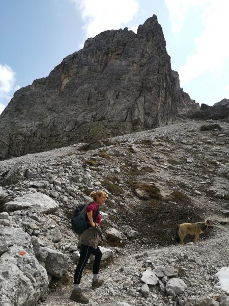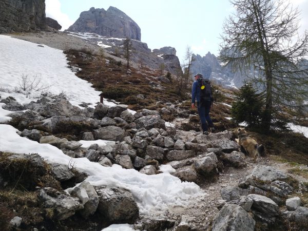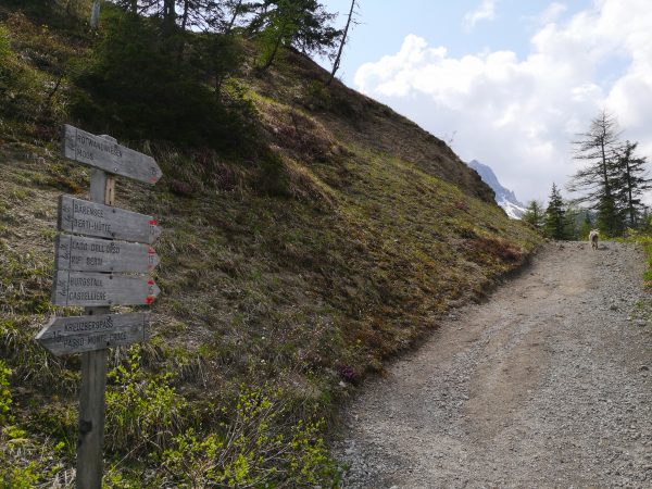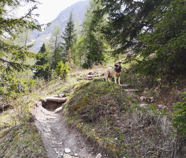 Wir folgen zunächst dem Wanderweg 13 a, der uns am Weißbach entlang mal auf schmalem Wurzelpfad, abschnittsweise auf befestigten Wegen zum Kreuzbergpass bringt. Hier queren wir die Hauptstraße und wandern bergauf, dem Wanderweg 15 Richtung Burgstall (Castelliere) folgend. Bald verjüngt sich der Weg, der Wald lichtet sich und wir erreichen eine offene Wiese mit kleiner Liftanlage. Zeit für eine erste Pause mit atemberaubenden Blick auf die Sextener Dolomiten und hinüber zum Karnischen Hauptkamm. Weiter geht`s auf dem Weg Nummer 15, jetzt auf schmalem Bergsteig in mäßiger bis recht knackiger Steigung. Wir erreichen einen Bunker aus dem 1. Weltkrieg, eine von vielen Befestigungsanlagen, die weiter oben auch direkt in den Felsen gehauen sind. Am Bunker folgen wir jetzt dem Weg 15 a, der uns schließlich zu einer mächtigen Schutthalte unter dem Arzalpenkopf bringt. Unser Plan: Auf dem 15 a das Schuttfeld weitgehend eben unter dem Burgstall queren und bis zur Rotwandwiesen laufen. (Ein Pfad, der keine besonderen Anforderungen stellt.) Doch weil wir zu früh im Jahr unterwegs sind, übersehen wir den schmalen Pfad durchs Geröll, dessen Einstieg unter einem Schneefeld liegt. Stattdessen steigen wir steil bergauf Richtung Arzalpensattel. Nach etlichen Höhenmetern mit atemberaubendem Panoramablick kehren wir unter den Schießscharten in der Flanke des Arzalpenkopfes wieder um. Unser Amos, behände wie eine Bergziege, wäre problemlos hinauf und vor allem hinunter gekommen. Wir haben unsere Stöcke nicht dabei, also kehren wir um. Auf dem Rückweg machen wir über sattgrüne Wiesen noch einen Abstecher zum – fast ausgetrockneten – Bärensee und zum Bunker über der Wiese. Dann geht`s auf dem gleichen Weg zurück. Auch wenn wir unseren Weg nicht wie geplant haben wandern können, ist die Tour mit Hund superschön und auch für Flachlandtiroler problemlos zu meistern.