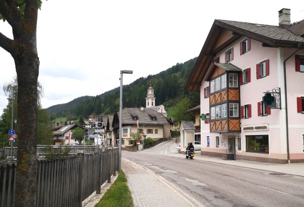 Unser Ausgangspunkt: der Parkplatz an der Dolomitenstraße im Sextener Zentrum. Hier laufen wir über die Brücke Richtung Schießstand.