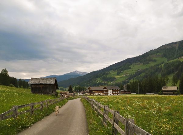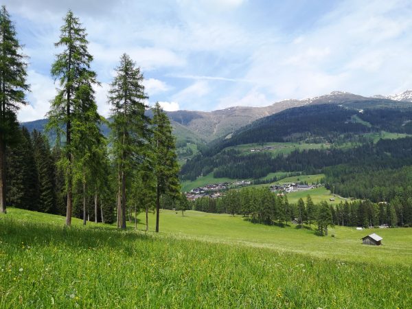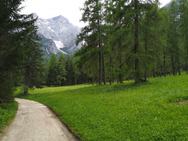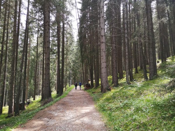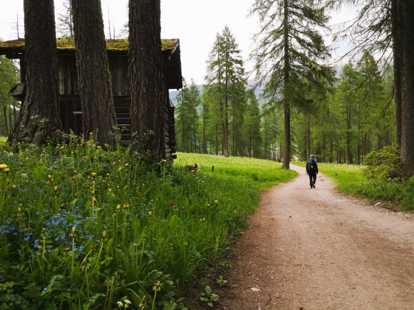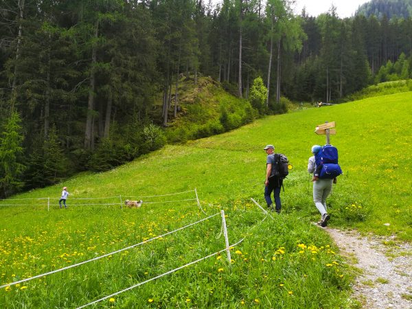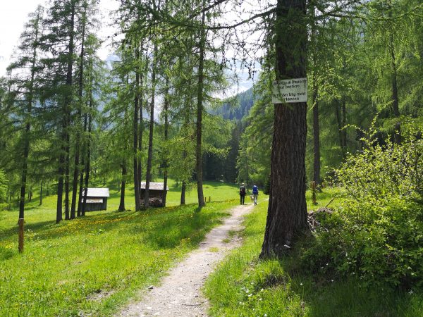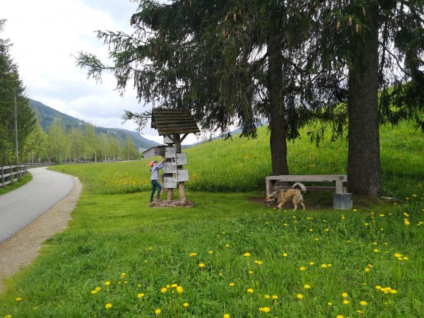 Zurück laufen wir zunächst auf dem vertrauten Weg aus dem Fischleinboden hinaus(, vorbei an der Haltestelle des Buses, der einen Teil von zurück zum Parkplatz bringt). An der Weggabelung – geradeaus und bergauf würden wir bald wieder den Weg durch die Wiesen erreichen – folgen wir nun dem Pfad rechts ab und den Berg hinunter. Wir laufen Richtung Sexten und Bad Moos, jetzt parallel zu den Lärchenwiesen. Immer weiter Richtung Sexten gehend, stößt unser Weg schließlich auf das Sträßchen, das parallel zum Sextener Bach verläuft. Von hier aus geht`s zurück zum Ausgangspunkt.